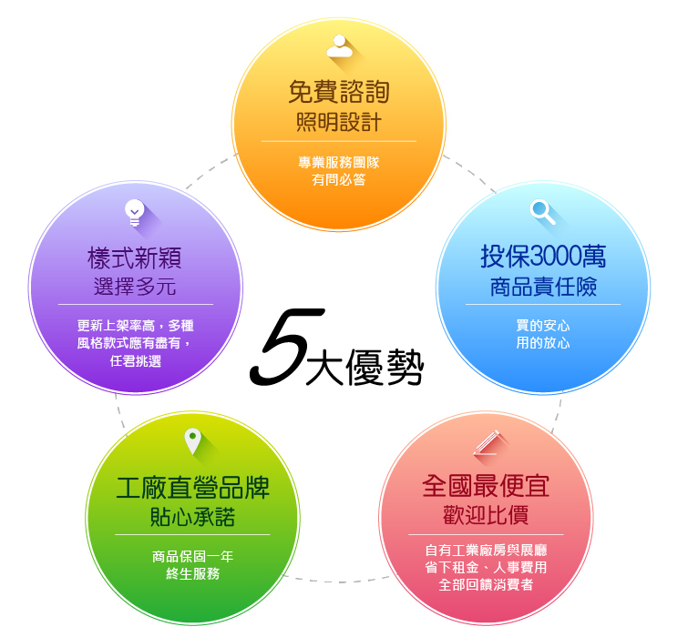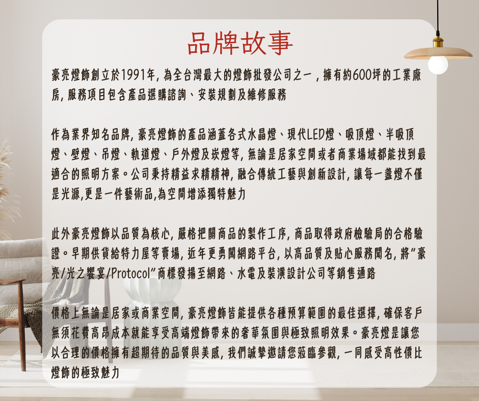 擁有約600餘坪的工業廠房,致力於位客人提供獨具匠心的燈飾商品專業的服務團隊確保每位客戶都能獲得最完善的購物與使用體驗,巿場售價一半的批發價格直接面對您,我們深知燈具不僅是照明工具,更是空間氛圍的靈魂,因此在確保價格親民的同時,也絕不妥協於品質系列商品取得政府檢驗局商檢合格認証,並保有商品保固一年及終身服務的貼心承諾,讓客戶的購物體驗更佳安心、無憂