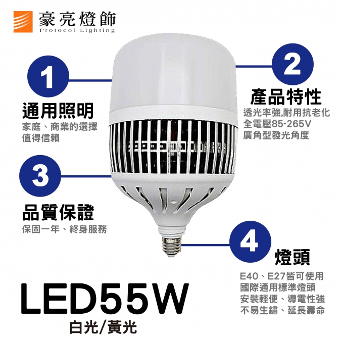 LED 55W大燈泡 (白光/黃光) E27/E40燈座通用