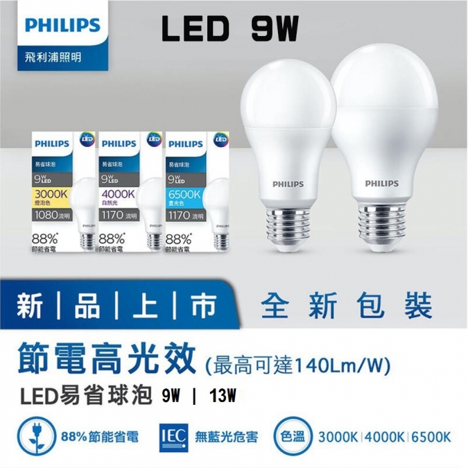 PHILIPS飛利浦LED E27 9W燈泡 白光/黃光/自然光