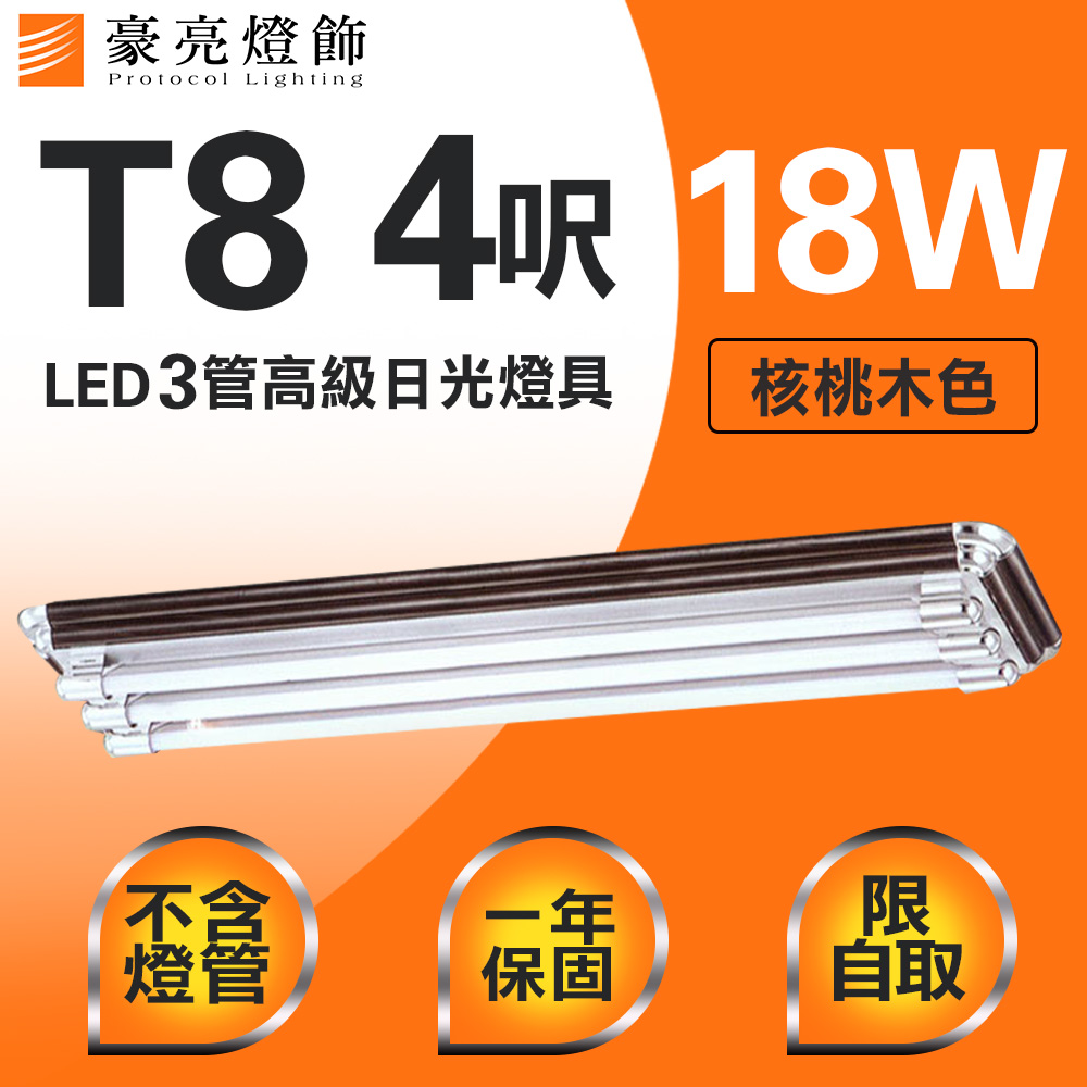 品名 T8 LED 18W 4呎 3管高級日光燈具-核桃木色(限自取/不寄送) 描述 長金屬燈體烤核桃木色 尺寸 長139cm*寬29cm*高11cm 光源 另購T8 4呎燈管*3 附小夜燈 2W*1 附電子開關 適用 皆可