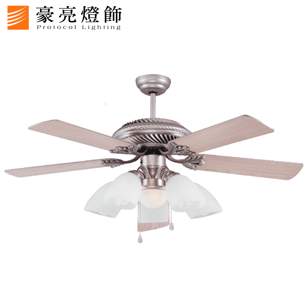 品名 52吋 霧鋁檀木/5+1燈 (AS-32175)【MIT台灣製造】 描述 吊扇規格:52吋 Ø188mm×16mm 石紋玻璃燈罩 光源 需另購E27*5+小夜燈*1 附件 附電子IC分段開關 適用 3-4坪