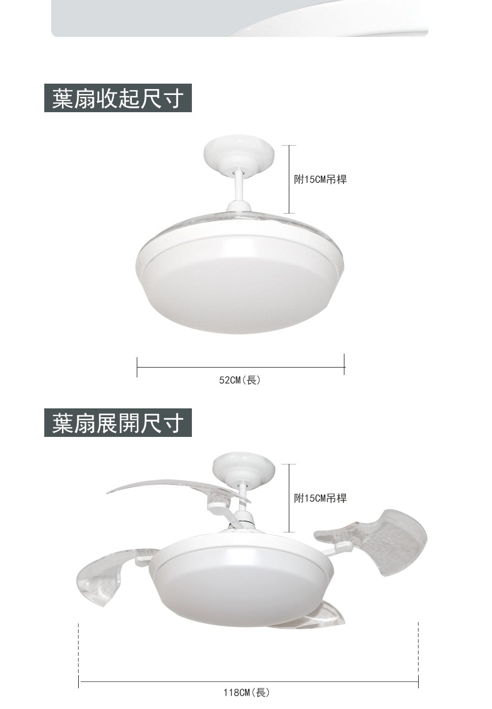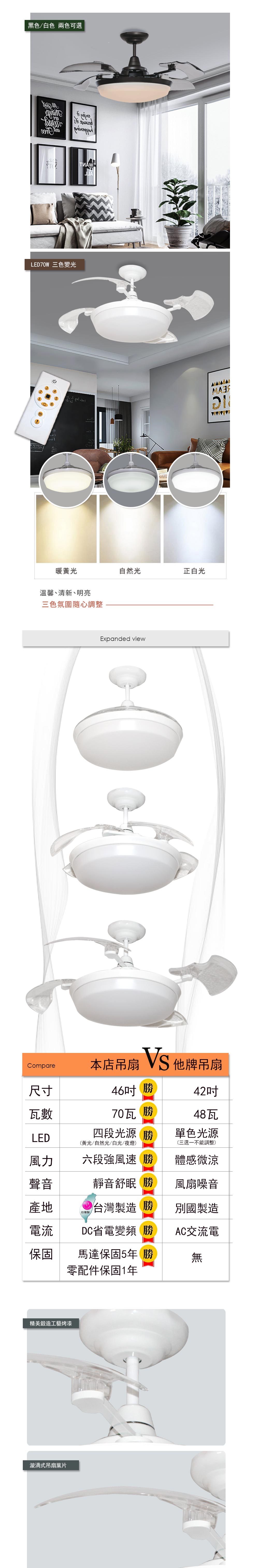 品名 46吋 尊爵黑/DC變頻隱形吊扇 LED 70W四段色光/附遙控器 描述 吊扇規格:46吋 Ø188mm×18mm 壓克力燈罩 重量:約16kg 光源 內附LED 70W四段光源 (白光/黃光/自然光/小夜燈) 附件 專用遙控器 適用 5-6坪