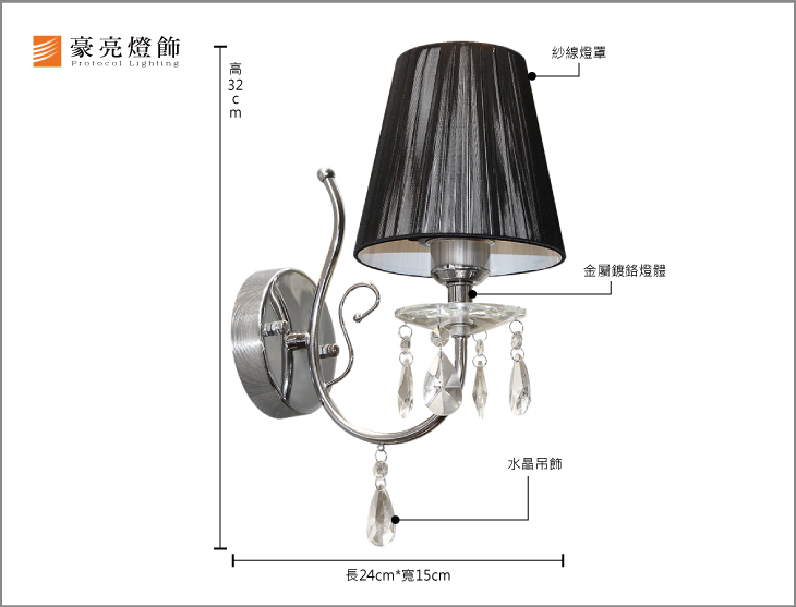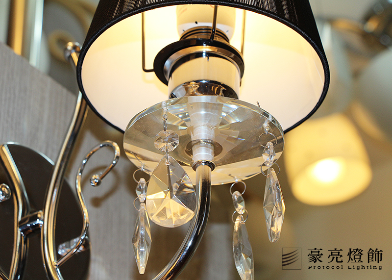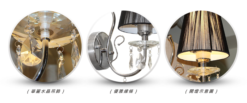 金屬鍍鉻燈體、水晶吊飾、紗線燈罩