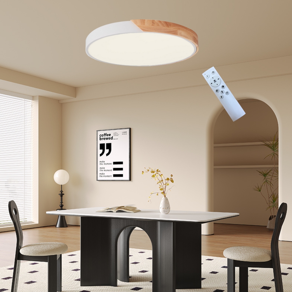 品名 LED 50W木紋+白/調光-調色吸頂燈(附遙控器) 材質 金屬烤漆/木質燈體、壓克力燈罩 尺寸 長寬約 50 cm * 高約 10 cm 光源 內附LED 50W三色光源 (白/黃/自然光) 最小流明400ml/最大流明4300ml 適用 約4-5坪