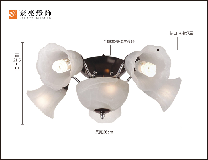 品名 紫檀風尚 5+1 半吸頂燈 材質 金屬鍍鉻+紫檀色燈體,玻璃燈罩 尺寸 長寬 68cm*高21.5cm(底座直徑19cm) 光源 另購E27*5及E27小夜燈*1(附IC電子開關) 適用 4-6坪