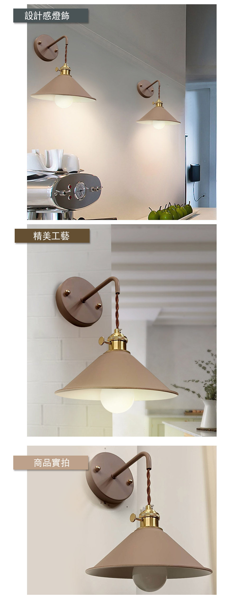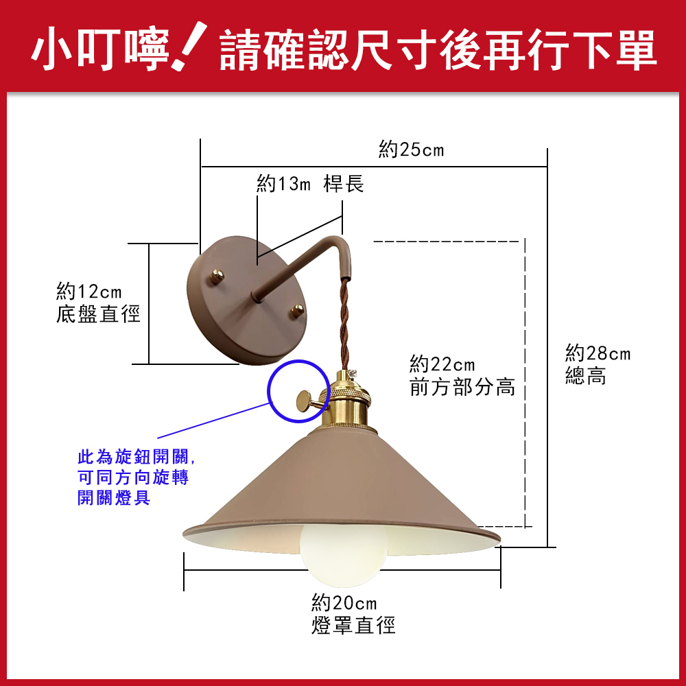 品名 馬卡龍 42號/奶茶色 單壁燈(附旋鈕開關) 材質 金屬馬卡龍燈罩 尺寸 長 25cm*寬 20cm*高 28cm(底盤直徑: 12cm) 光源 需另購E27燈頭燈泡*1 (燈具上有旋鈕開關, 同一方向旋轉即可開關燈具) 適用 約1-2坪