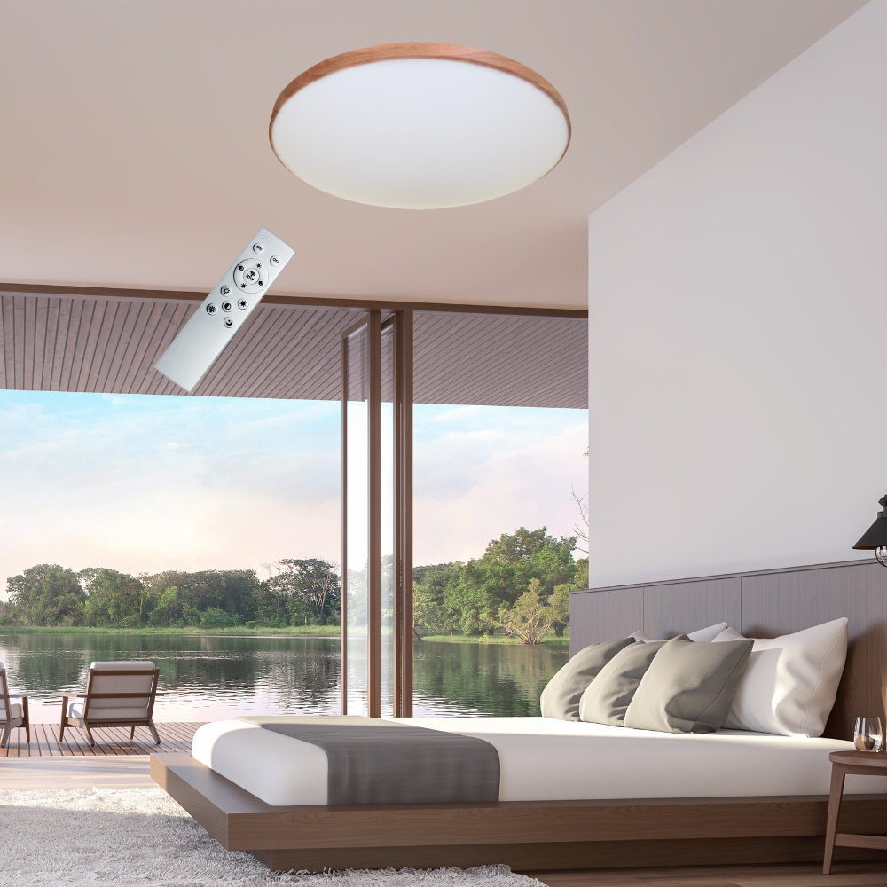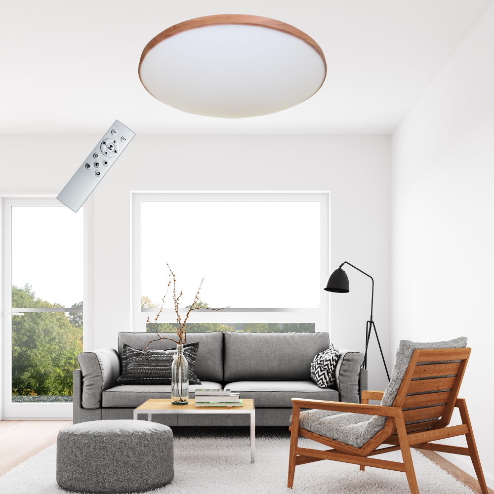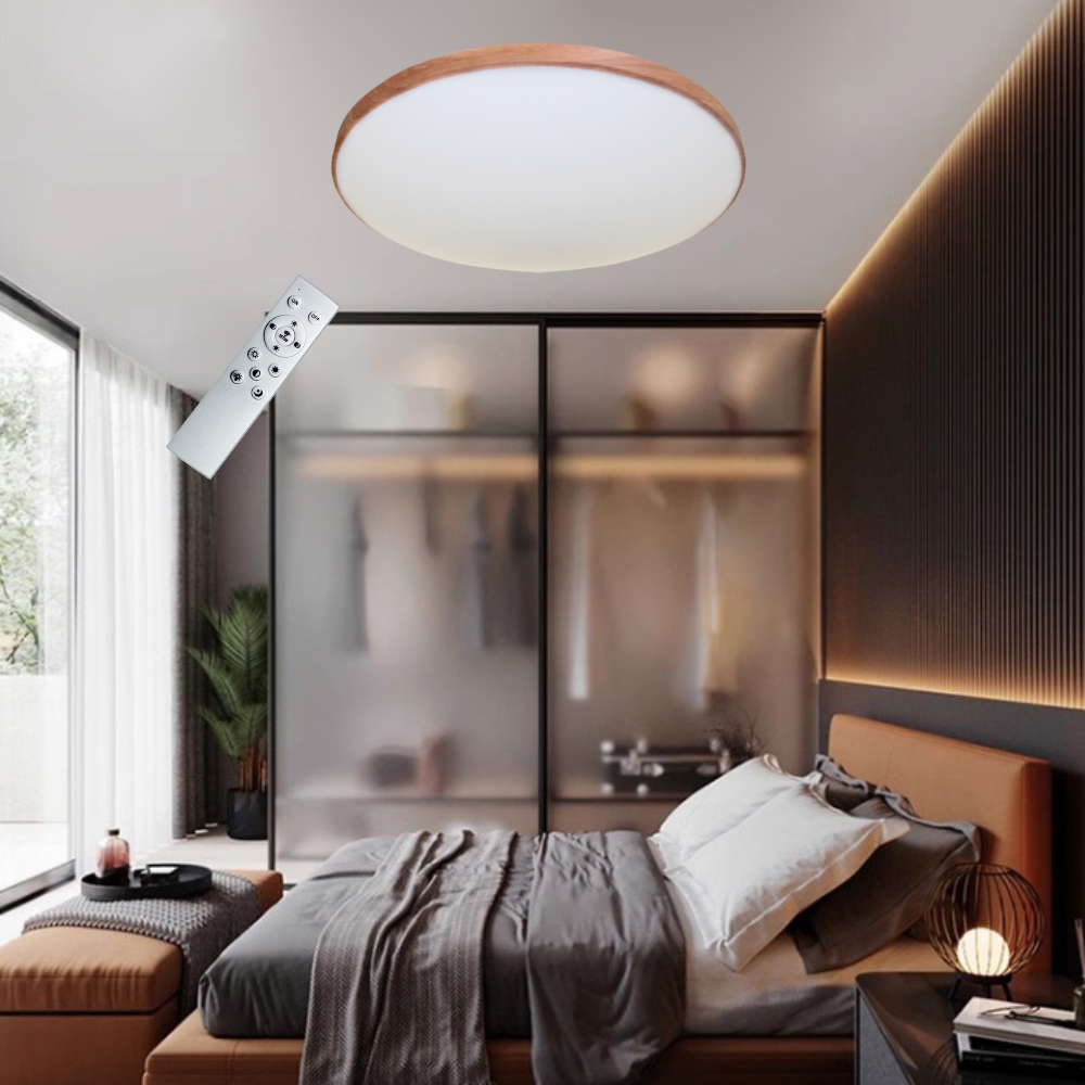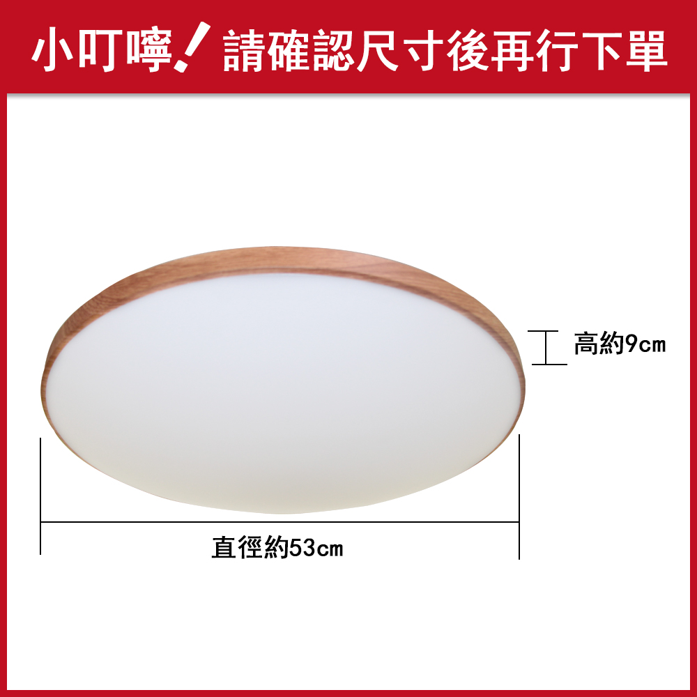 品名 LED 60W 銀河木紋調光調色吸頂燈(附遙控器) 材質 金屬烤漆/木紋燈體、壓克力燈罩 尺寸 直徑約 53 cm * 高約 9 cm 光源 內附LED 60W光源 (附遙控器可無極調光) 適用 適用約5-6坪