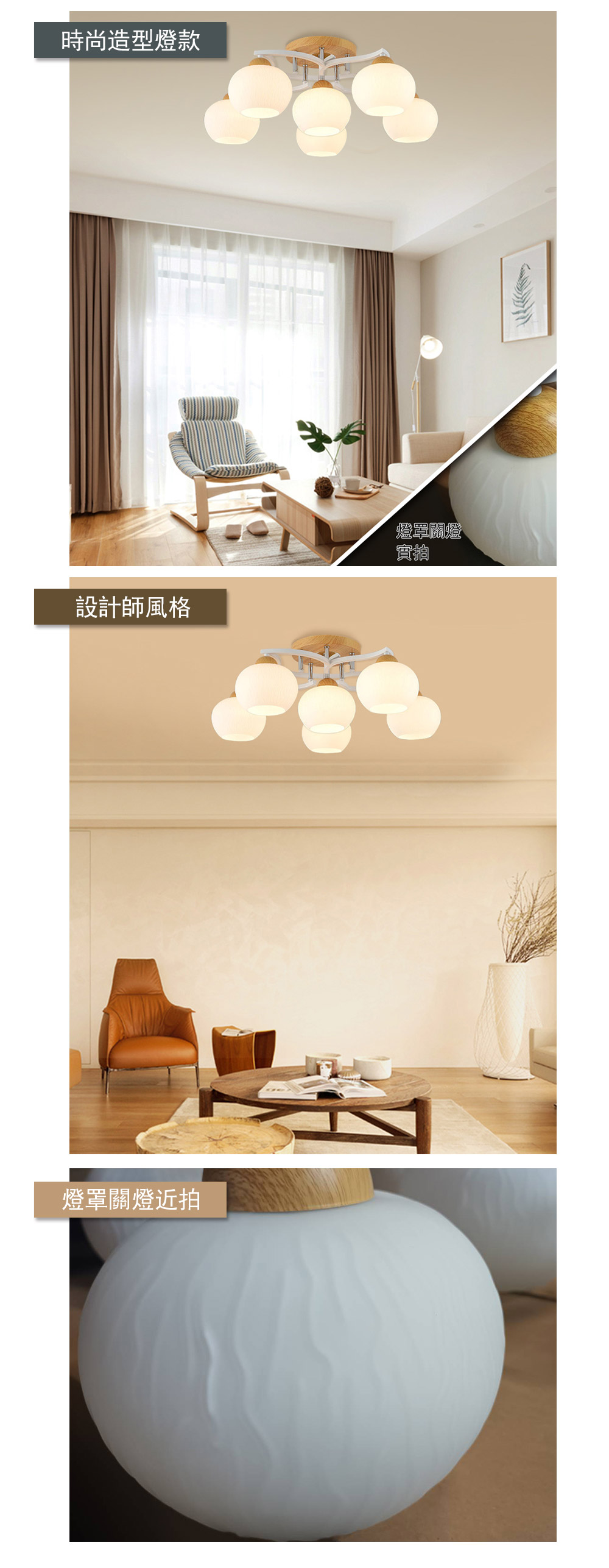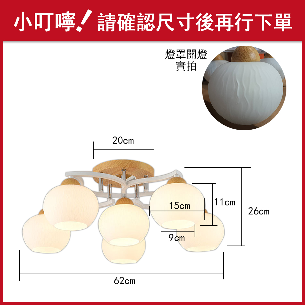 品名 威利斯 5+1 半吸頂燈 材質 金屬烤漆+木紋燈體/玻璃燈罩 尺寸 直徑 62cm * 高 26cm 吸頂盤: 直徑 20cm 光源 另購E27燈頭燈泡*6 (附電子IC分段開關) 適用 約5-7坪