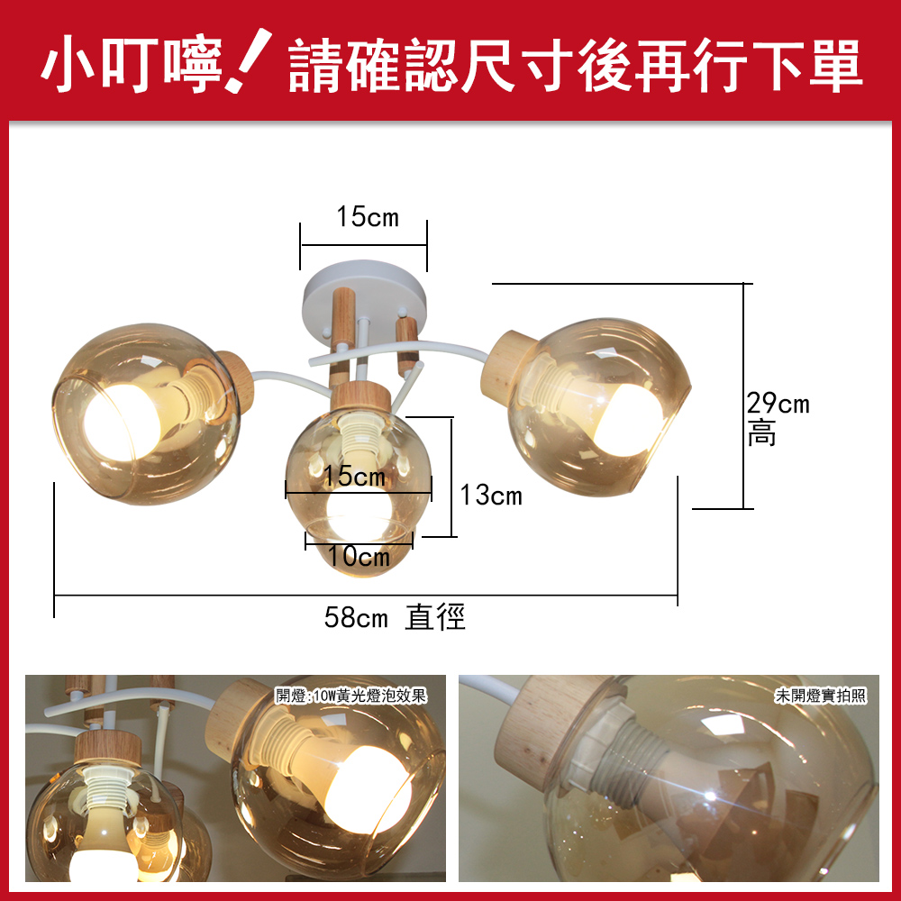 品名 原木/傑登 3+1 IC 半吸頂燈 材質 金屬烤漆+木質燈體/玻璃燈罩 尺寸 直徑 58cm * 高 29cm 吸頂盤: 直徑 15cm 光源 另購E27燈頭燈泡*4 (附電子IC分段開關) 適用 約3-5坪