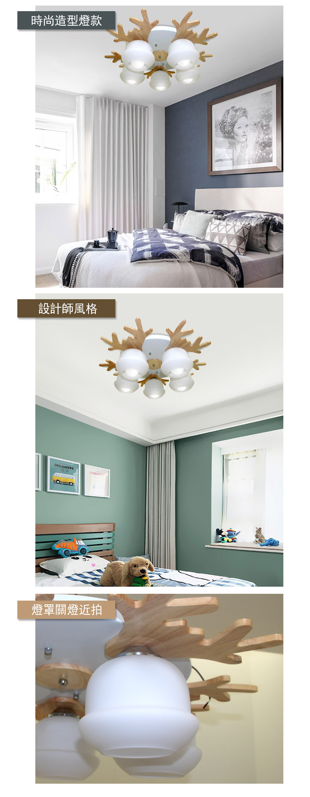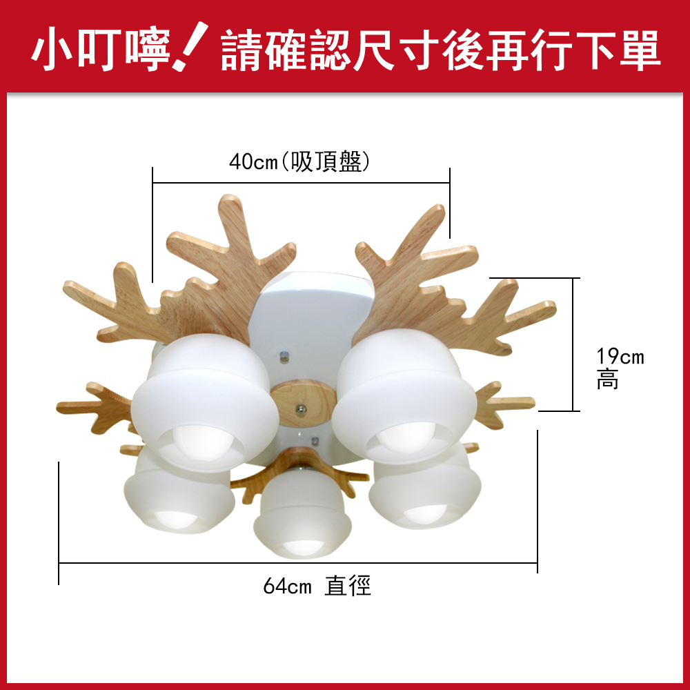 品名 原木/麋鹿 5 IC 半吸頂燈 材質 金屬烤漆+木質燈體/玻璃燈罩 尺寸 直徑 64cm * 高 19cm 吸頂盤: 直徑 40cm 光源 另購E27燈頭燈泡*5 (附電子IC分段開關) 適用 約5-7坪