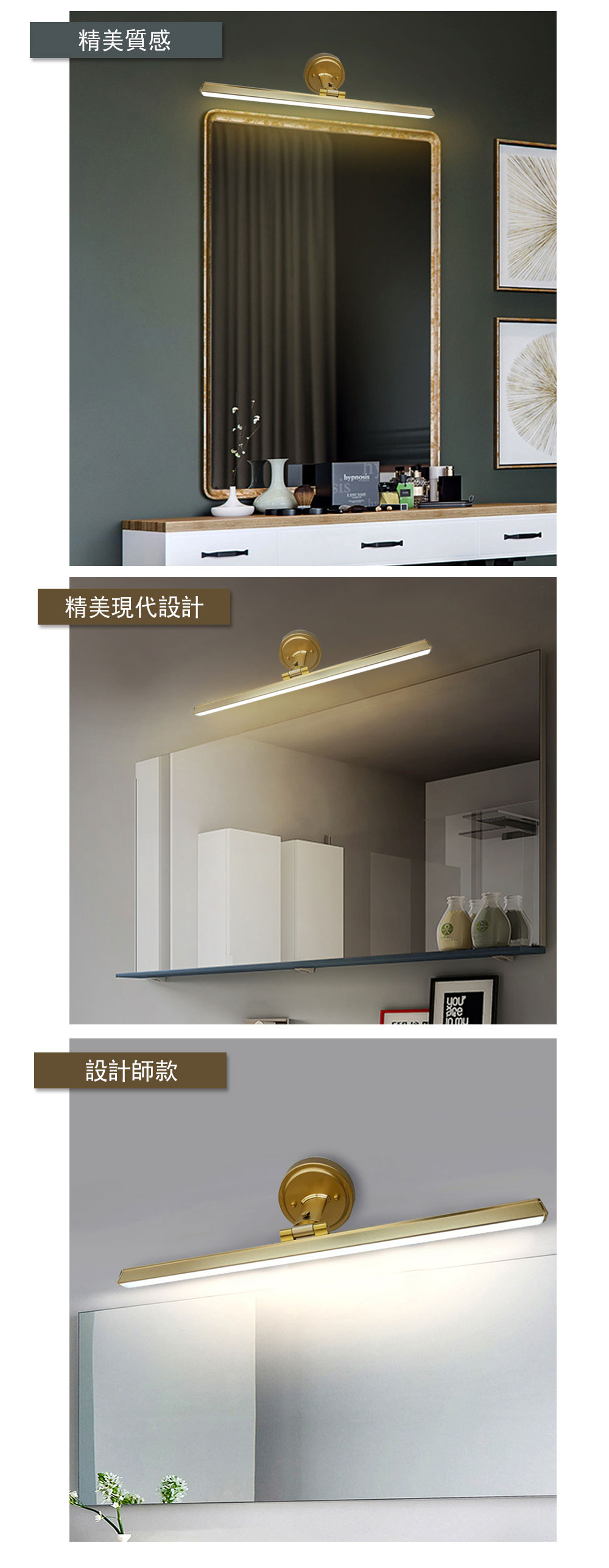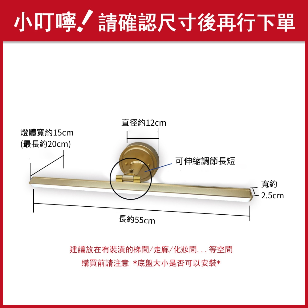 品名 LED 10W柏森/金色(鏡前/璧畫)燈-三色光 材質 金屬燈體 尺寸 燈具: 長約 55cm * 最寬約15cm (底盤直徑約12CM) 光源 內附LED10W 三色光光源 (壁切變光:白/黃/自然光) 適用 約1坪內 建議放在有裝潢的梯間/走廊/化妝間...等空間 *購買前請注意底盤大小是否可安裝*