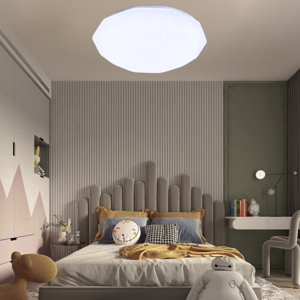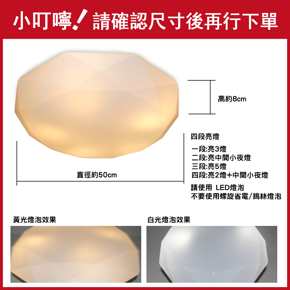 品名 雷諾斯 5+1 燈吸頂燈(壓克力) 材質 金屬燈體+壓克力燈罩 尺寸 直徑 50cm * 高 8cm 光源 另購 E27燈頭燈泡 * 5 + E27燈頭 小夜燈 *1 (1)請使用LED燈泡,不要使螺旋省電/鎢絲燈泡) (2)燈泡尺寸 建議使用 一般 LED 12W 以下大小 【內附 電子IC分段】 一段:亮3燈 二段:亮中間小夜燈 三段:亮5燈 四段:亮2燈+中間小夜燈 適用 約4-6坪