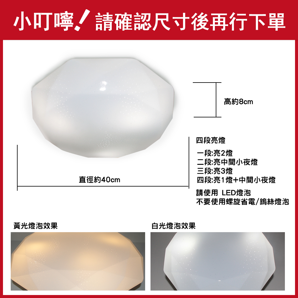 品名 雷諾斯 3+1 燈吸頂燈(壓克力) 材質 金屬燈體+壓克力燈罩 尺寸 直徑 40cm * 高 8cm 光源 另購 E27燈頭燈泡 * 3 + E27燈頭 小夜燈 *1 (1)請使用LED燈泡,不要使螺旋省電/鎢絲燈泡) (2)燈泡尺寸 建議使用 一般 LED 12W 以下大小 【內附 電子IC分段】 一段:亮2燈 二段:亮中間小夜燈 三段:亮3燈 四段:亮1燈+中間小夜燈 適用 約2-4坪