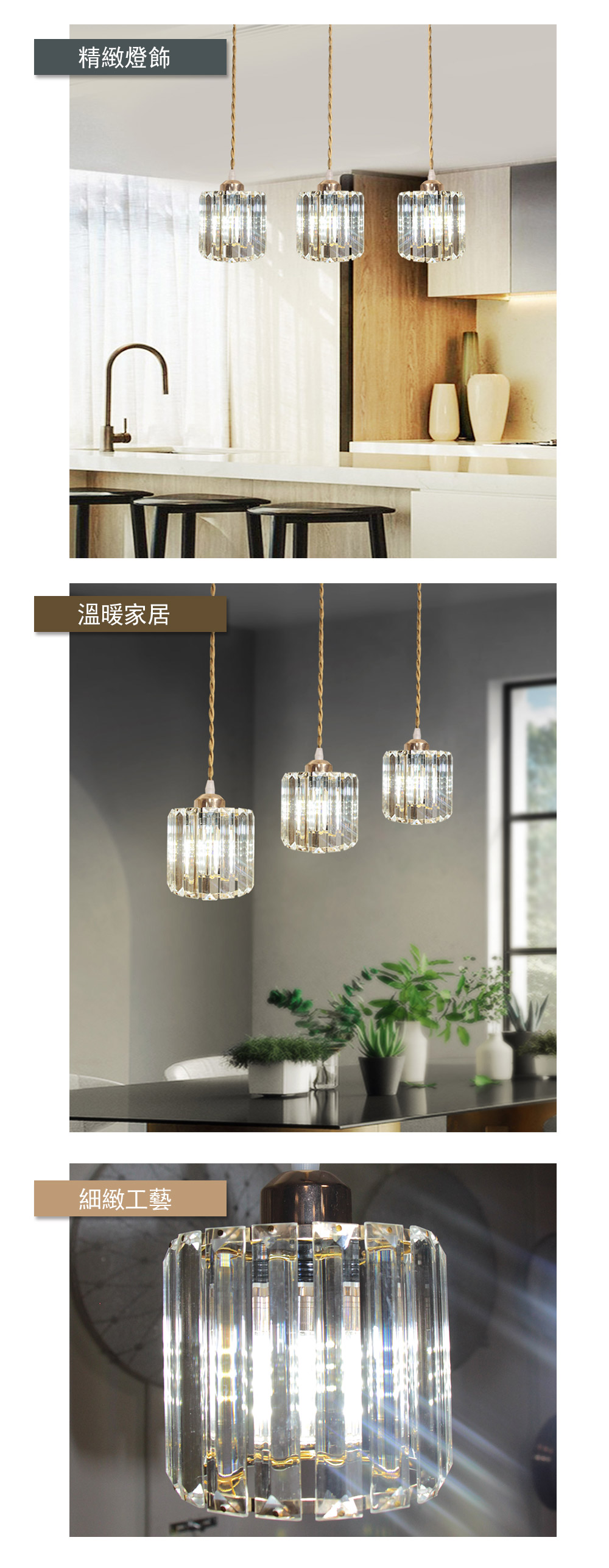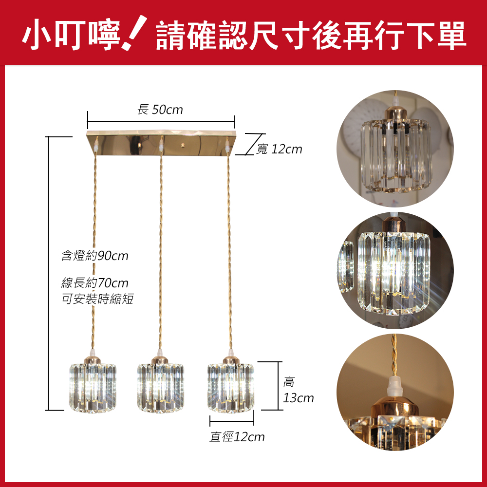 品名 維納斯/橫桿 3 吊燈 材質 金屬鍍金燈體/水晶片 尺寸 燈罩一只 約高13cm*直徑12cm 燈盤長約50cm*寬12cm 含燈最高約 90cm (附線約70cm 可縮短調整) 光源 須另購E27燈頭燈泡*3 適用 適用約2-3坪