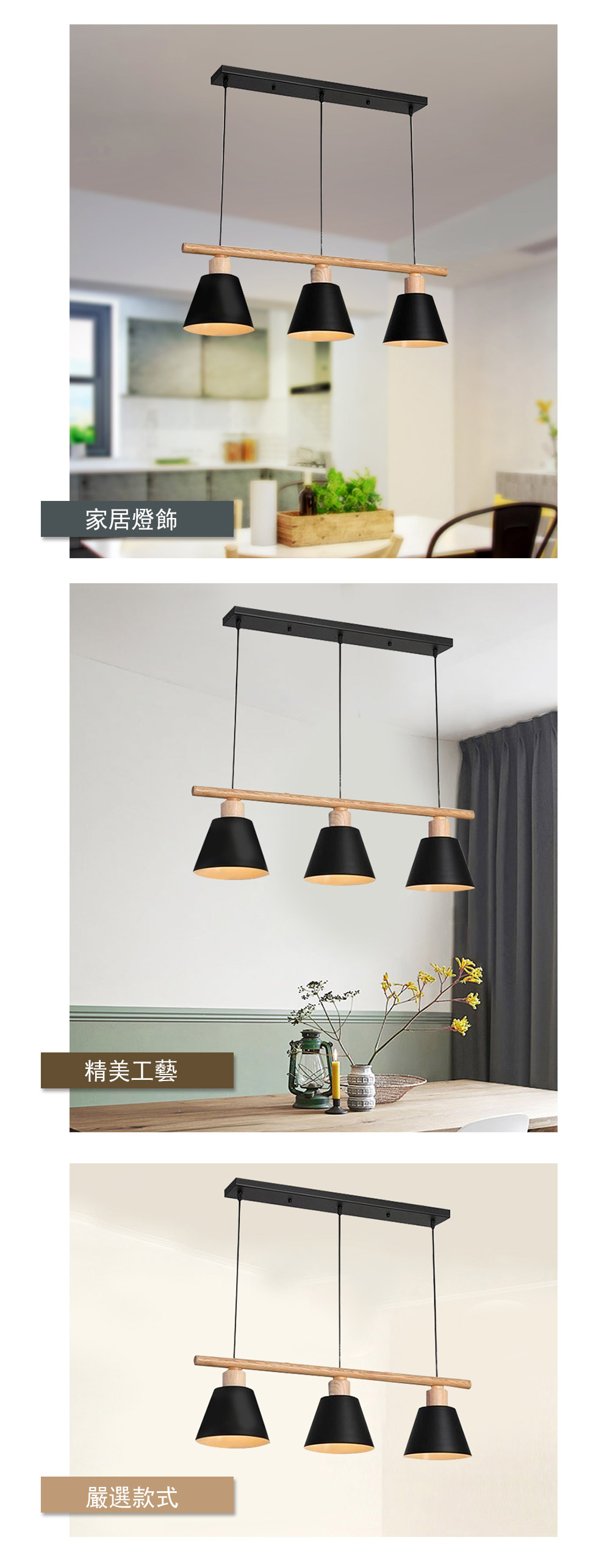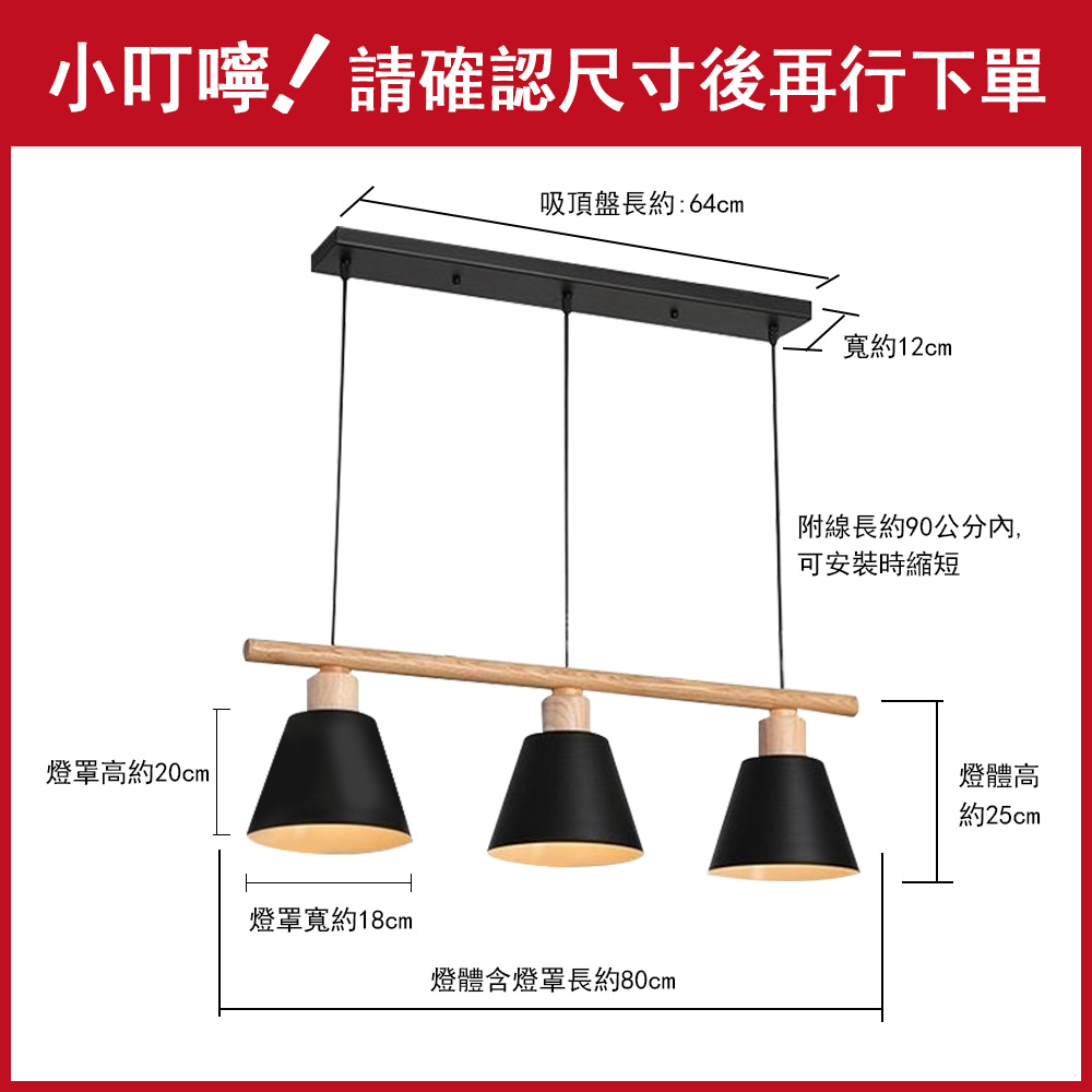 品名 原木/卡德恩 橫桿 3 燈吊燈 材質 金屬+木頭燈體+黑色鐵罩 尺寸 長 80cm *寬 18cm * 高約115cm(可調) *線長約90cm可自行調整 光源 另購E27燈泡 *3 適用 約3-4坪
