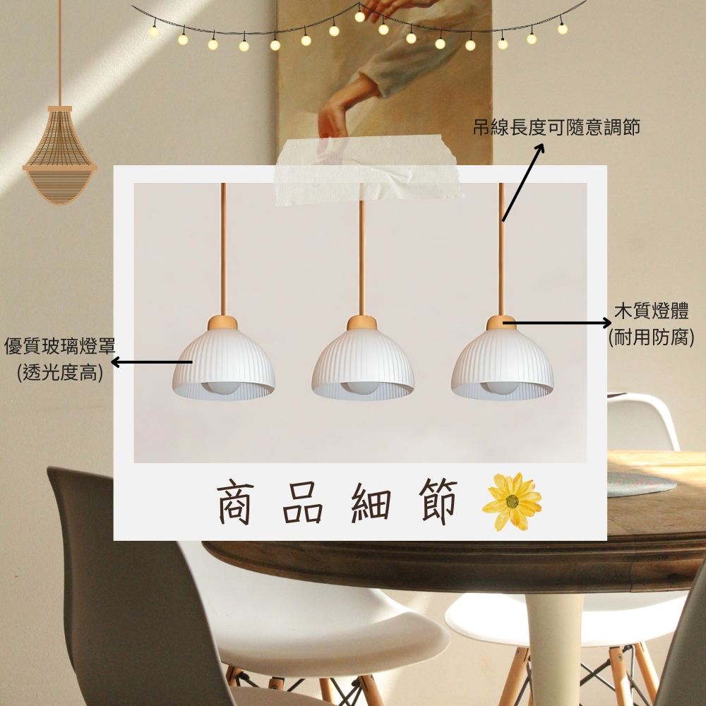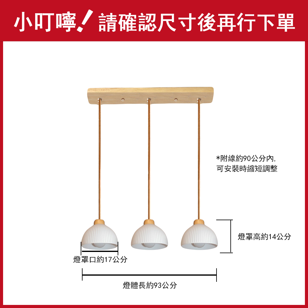 品名 史維格/橫桿 3 吊燈 材質 原木燈體/玻璃燈罩 尺寸 燈罩一只 約高14cm*燈罩口直徑17cm *整體直徑約93公分長 (附線約90cm 可縮短調整) 光源 另購E27燈頭燈泡*3 適用 適用約2-3坪