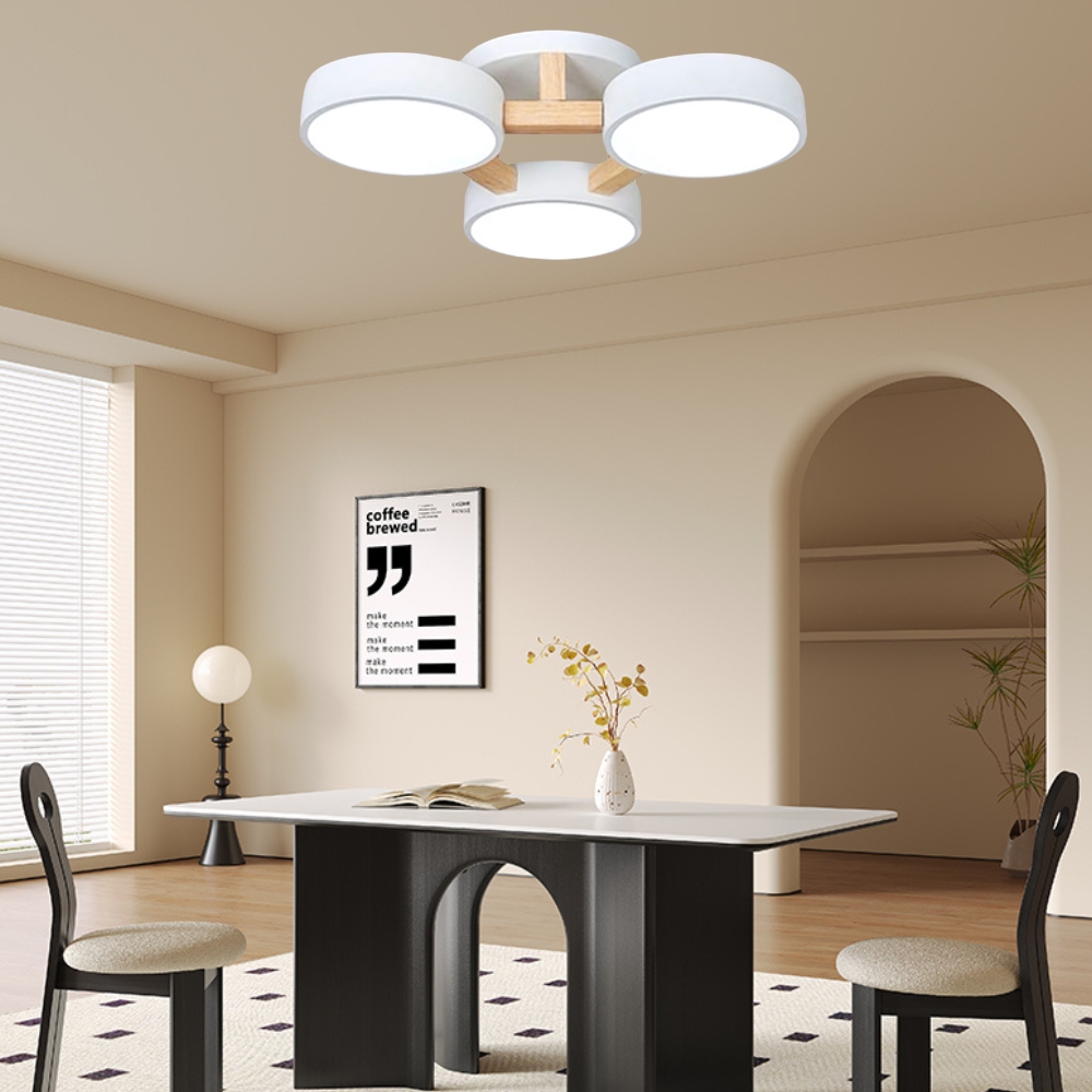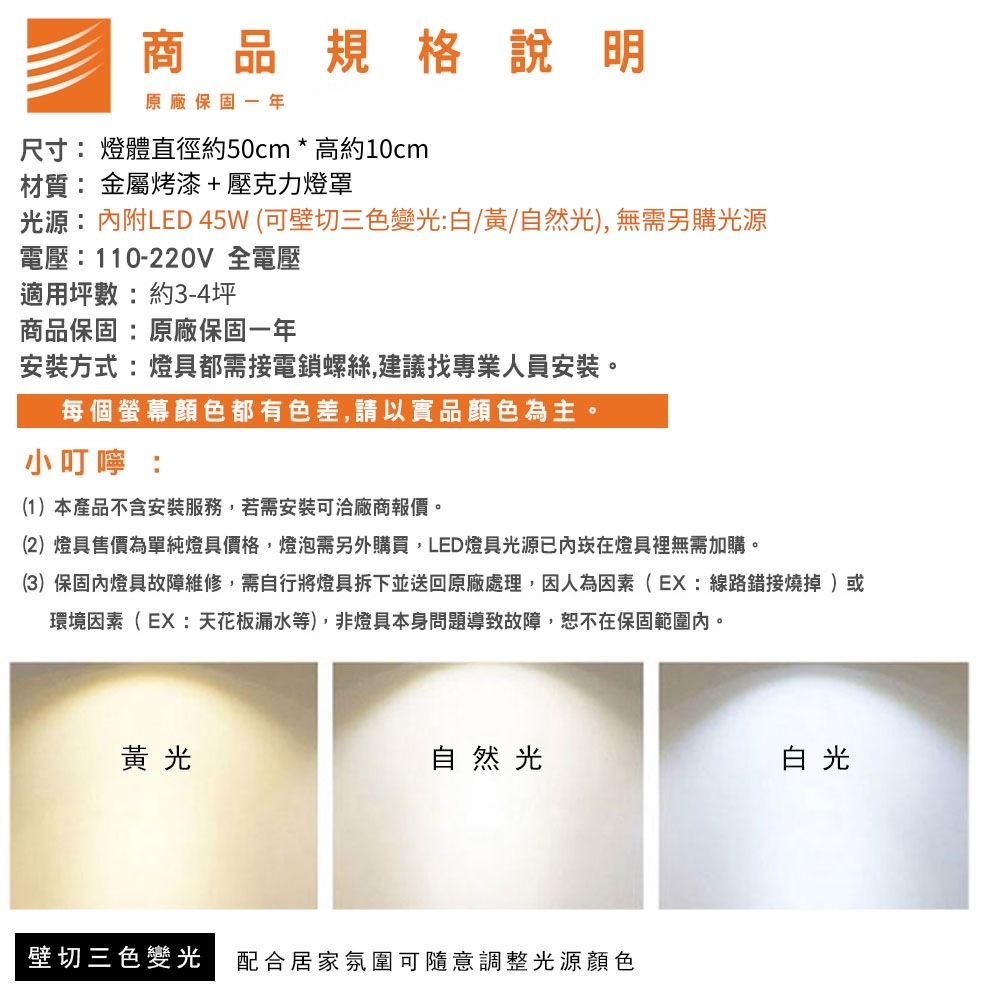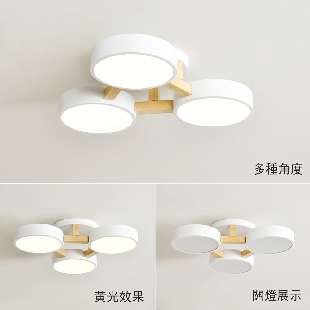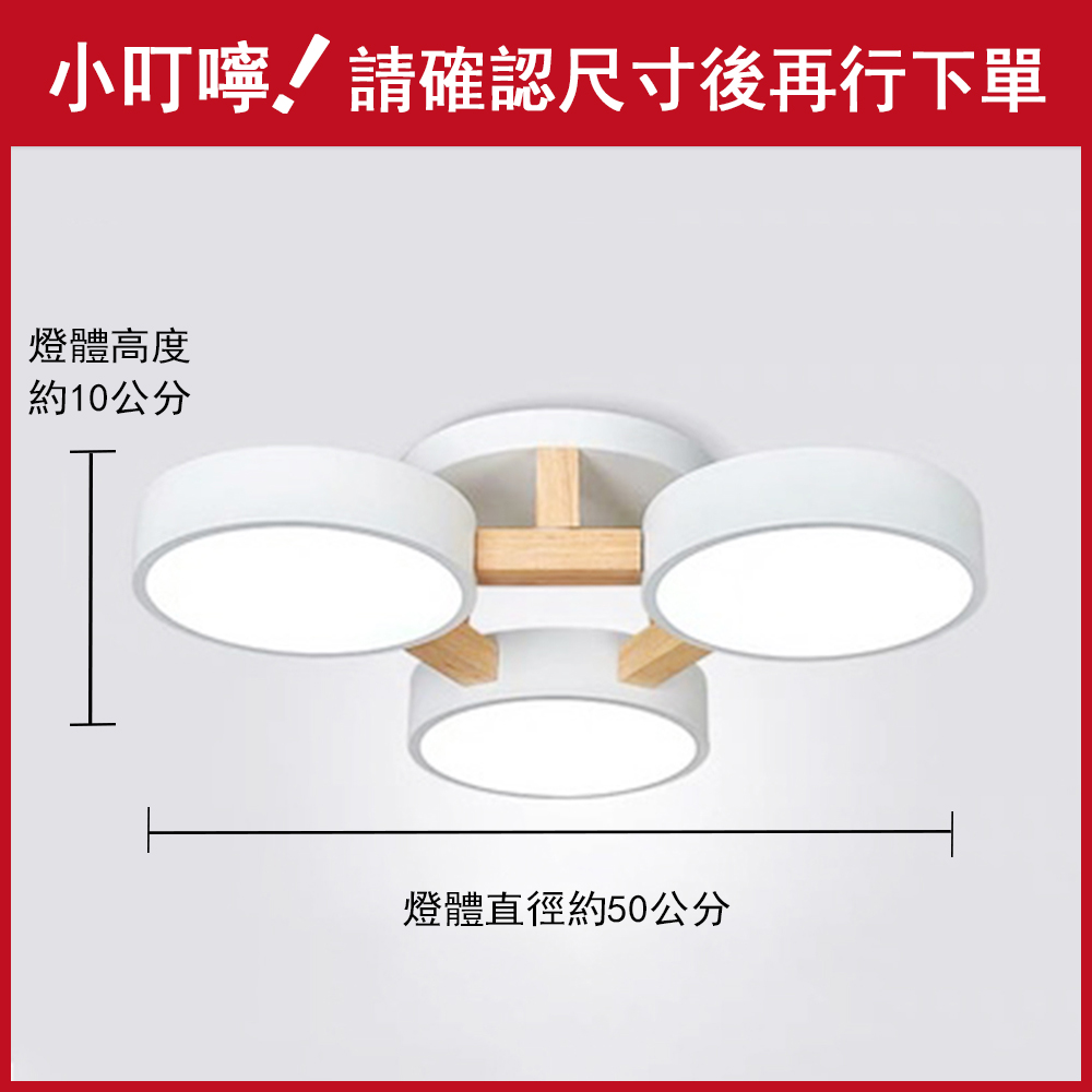 品名 馬卡龍/原木+白罩(LED 45W 三色光)3燈半吸頂燈 材質 金屬烤漆、壓克力燈罩 尺寸 長寬 50 cm * 高 10 cm 光源 內附LED45W 三色光源(白光/黃光/自然光) 適用 約3-4坪 -