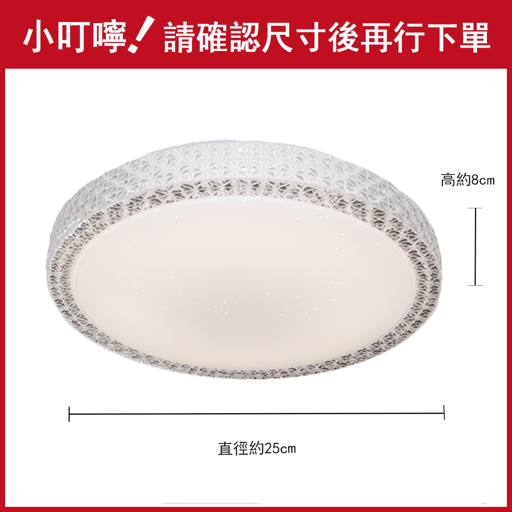 品名 貝拉 2 燈吸頂燈(壓克力) 材質 金屬燈體+壓克力燈罩 尺寸 直徑 25cm * 高 8cm 光源 另購 E27燈頭燈泡 * 2 (1)請使用LED燈泡,不要使螺旋省電/鎢絲燈泡) (2)燈泡尺寸 建議使用 一般 LED 12W 以下大小 適用 約1-2坪