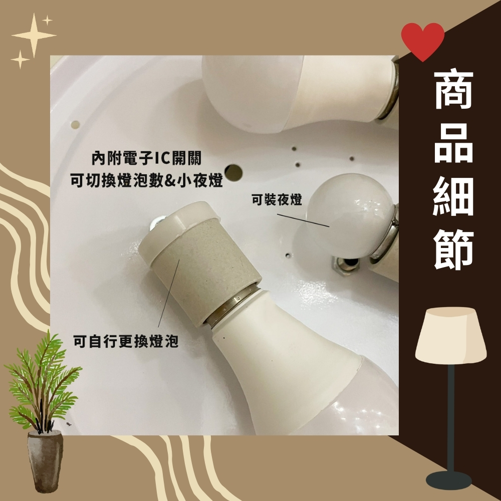 品名 潔白 3+1 燈吸頂燈(壓克力) 材質 金屬燈體+壓克力燈罩 尺寸 直徑 38cm * 高6.5cm 光源 另購 E27燈頭燈泡 * 3 + E27燈頭 小夜燈 *1 (1)請使用LED燈泡,不要使螺旋省電/鎢絲燈泡) (2)燈泡尺寸 建議使用 一般 LED 12W 以下大小 【內附 電子IC分段】 一段:亮2燈 二段:亮中間小夜燈 三段:亮3燈 四段:亮1燈+中間小夜燈 適用 約2-4坪