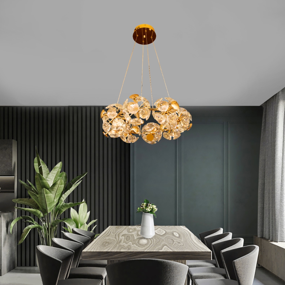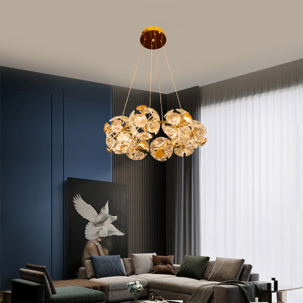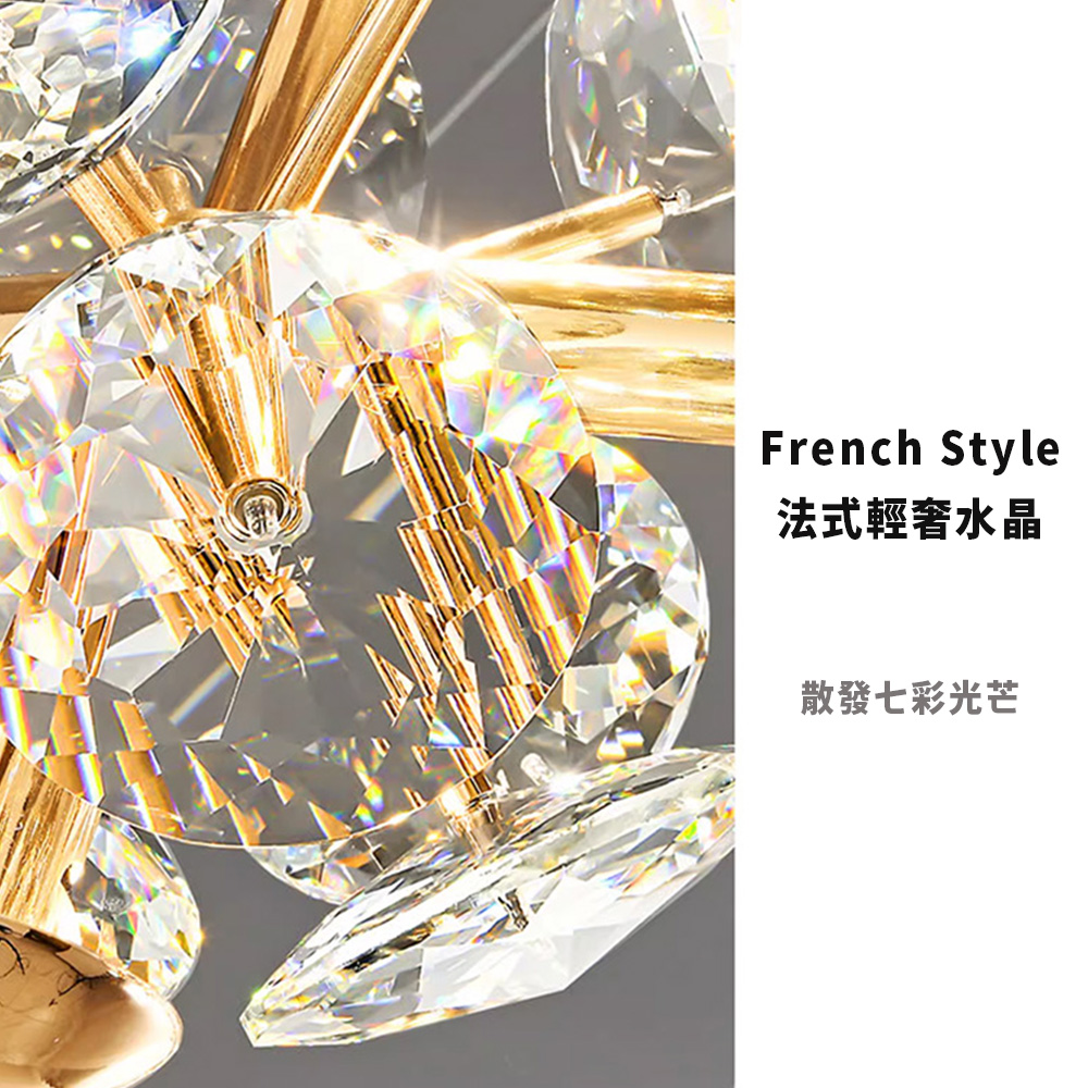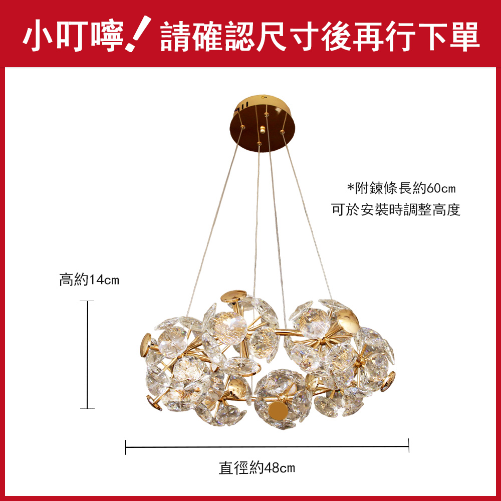 品名 LED 96W(8 燈)歐若拉水晶吊燈 材質 金屬燈體 尺寸 直徑 48cm * 不含吊鍊高 14cm(底盤直徑: 13cm) 附吊鍊約60cm 光源 附LED 96W 三色光源(壁切:白/自然/黃光) 適用 約3-4坪 (建議搭配間接照明或崁燈)