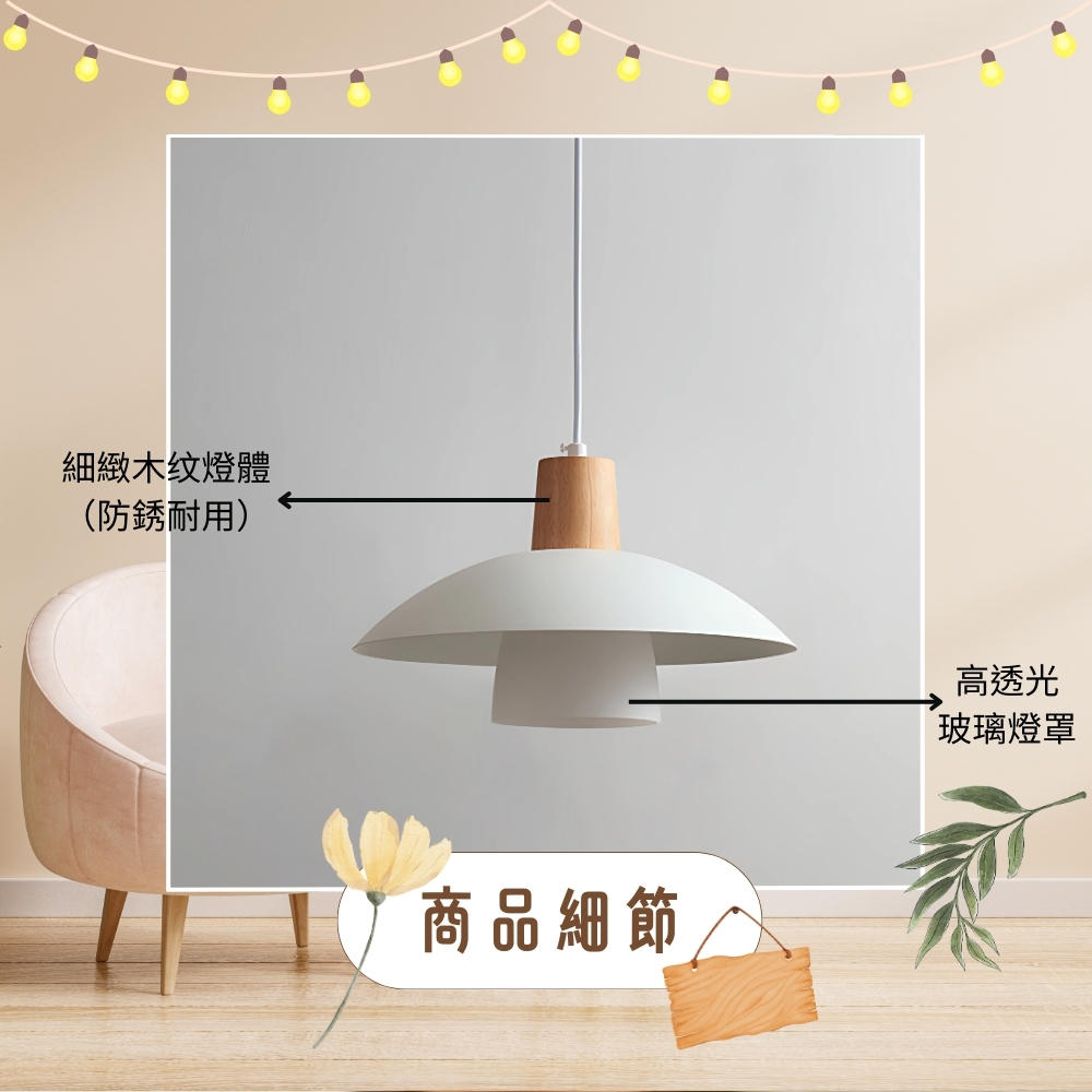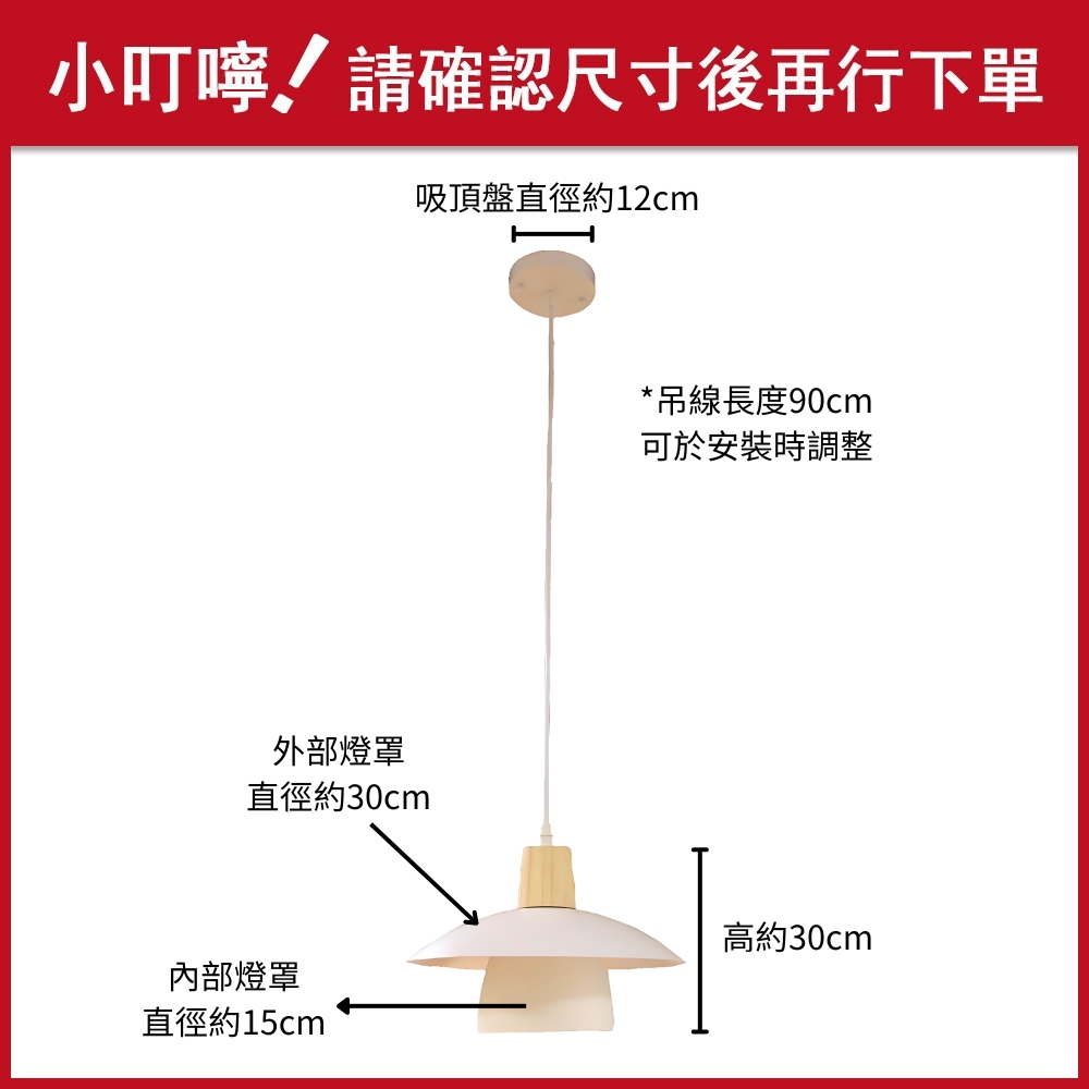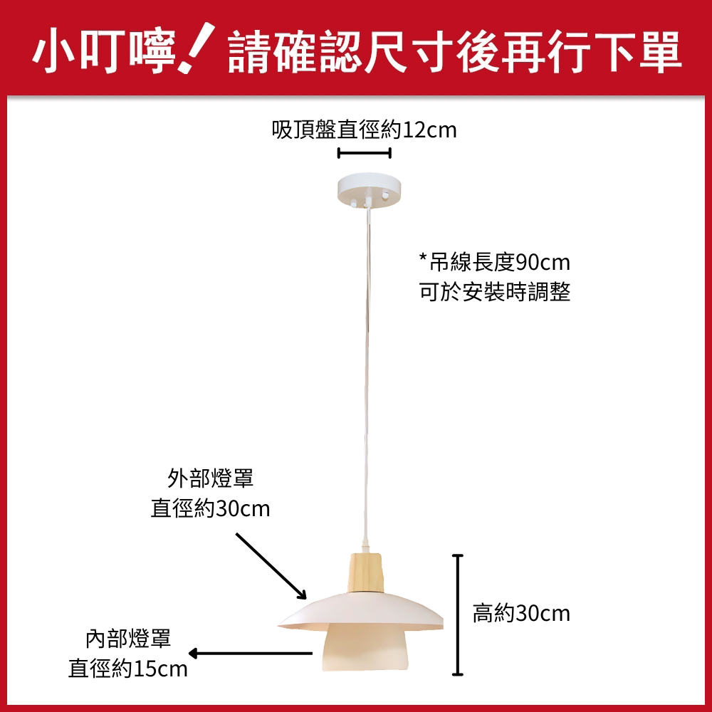 品名 新原木/遇見單吊燈 材質 原木+金屬燈體 尺寸 外部燈罩約30cm * 內部燈罩約15cm * 燈體高約30cm 吸頂盤直徑約12cm *吊線長度90cm可於安裝時調整 光源 另購E27 *1 適用 約1-2坪