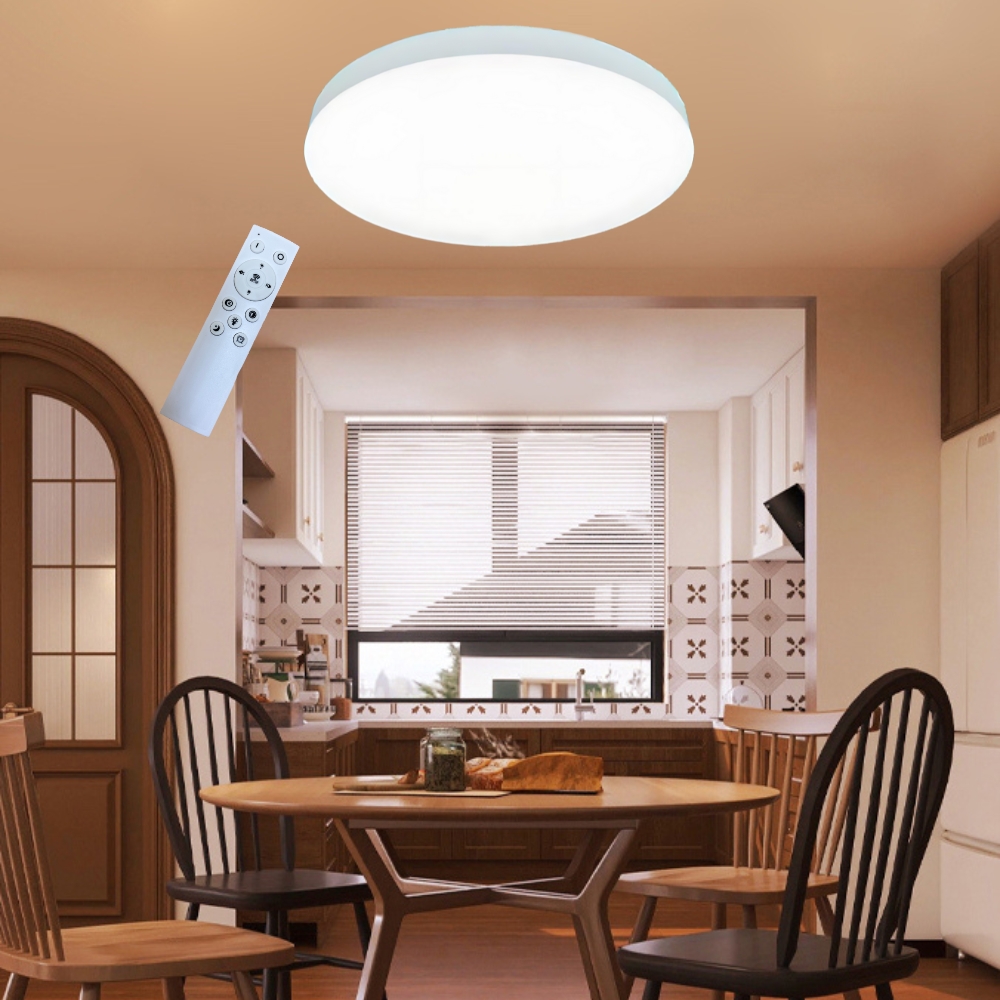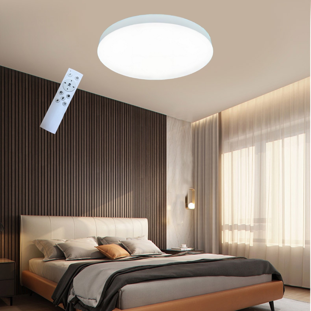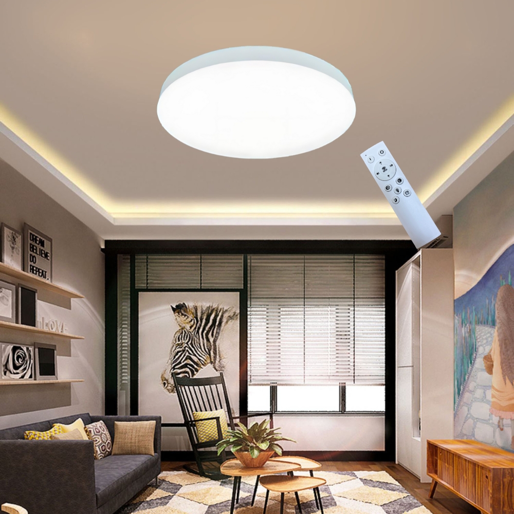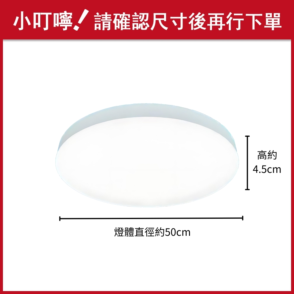 品名 LED 60W 純淨超薄型遙控吸頂燈 (可調光調色) 材質 金屬燈體、壓克力燈罩 尺寸 直徑約50cm * 高度約4.5cm 光源 內附LED 60W三色光源 (白/黃/自然光) 適用 約4-6坪