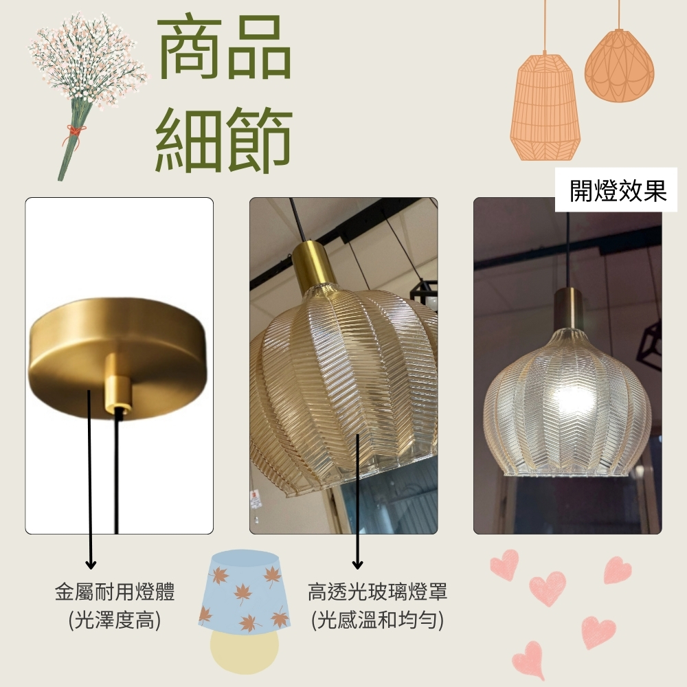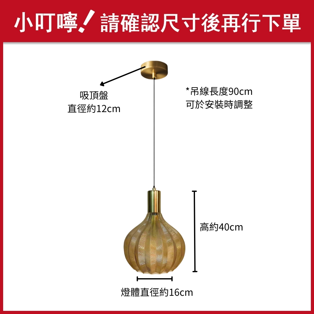 品名 飄渺單吊燈(玻璃) 材質 金屬燈體 + 玻璃燈罩 尺寸 燈體直徑約16cm * 高度約40cm 吸頂盤直徑約12cm (附線約90cm 可縮短調整) 光源 需另購E27燈頭燈泡*1 適用 適用約1-2坪