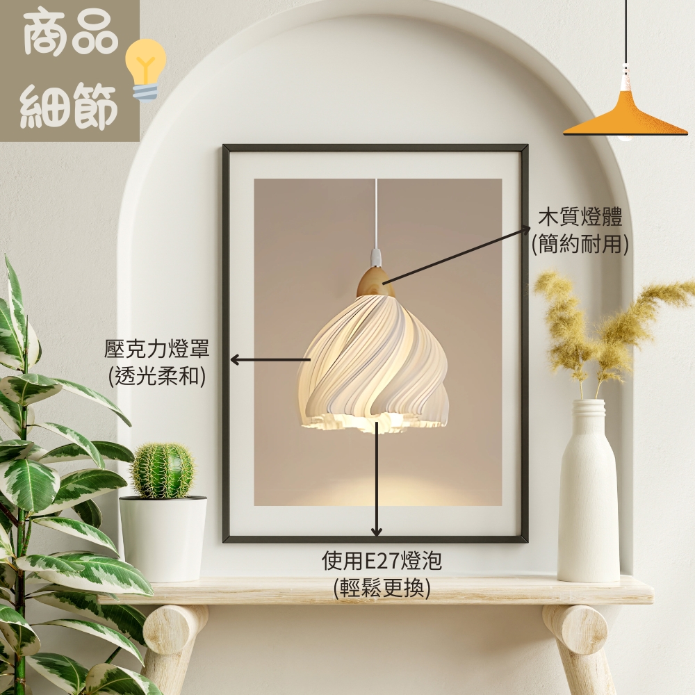 品名 3D 瑪琪朵單吊燈 材質 木質燈體 + 壓克力燈罩 尺寸 燈體長約25cm * 高度約30cm 吸頂盤直徑約12cm (附線約80cm 可縮短調整) 光源 需另購E27燈頭燈泡*1 適用 適用約1-2坪