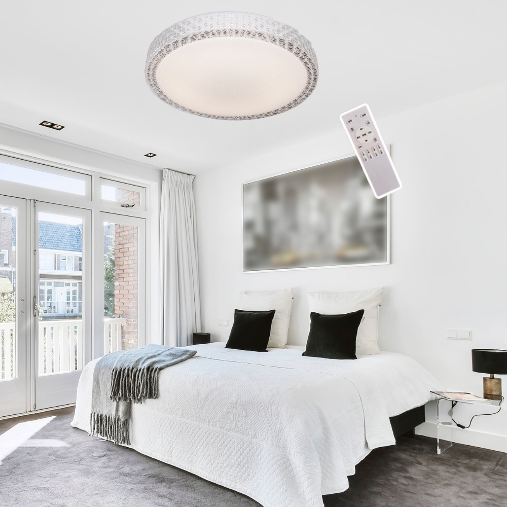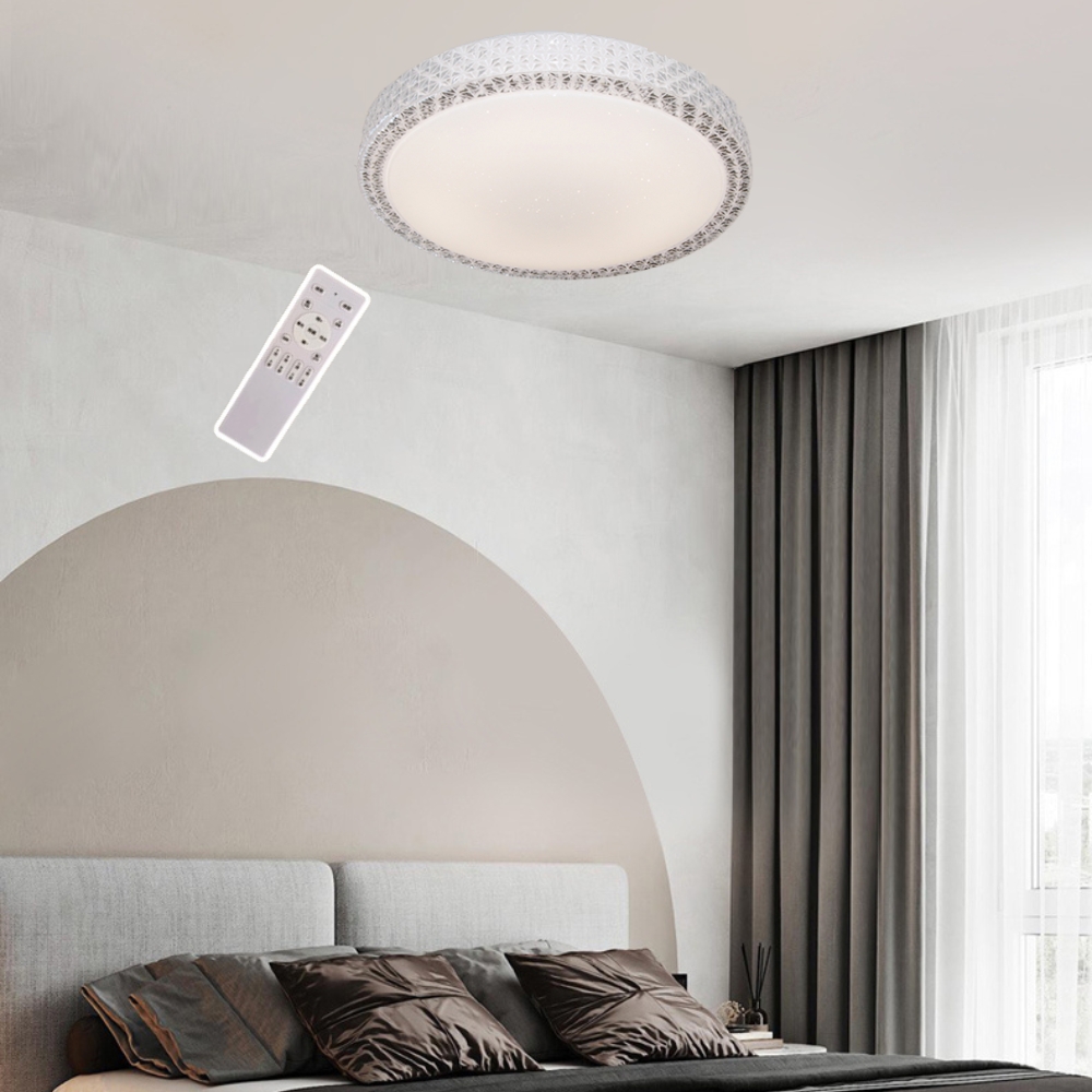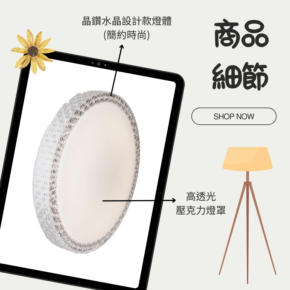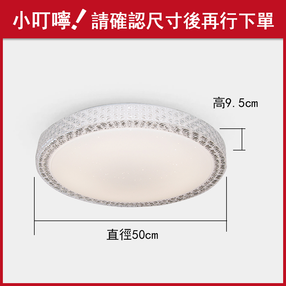 品名 LED 60W 流星-調光調色吸頂燈(附遙控器) 材質 金屬燈體/壓克力燈罩 尺寸 直徑 51.5 cm * 高 11 cm 光源 內附LED 60W光源 (附遙控器/可調光調色) 適用 約4-6坪