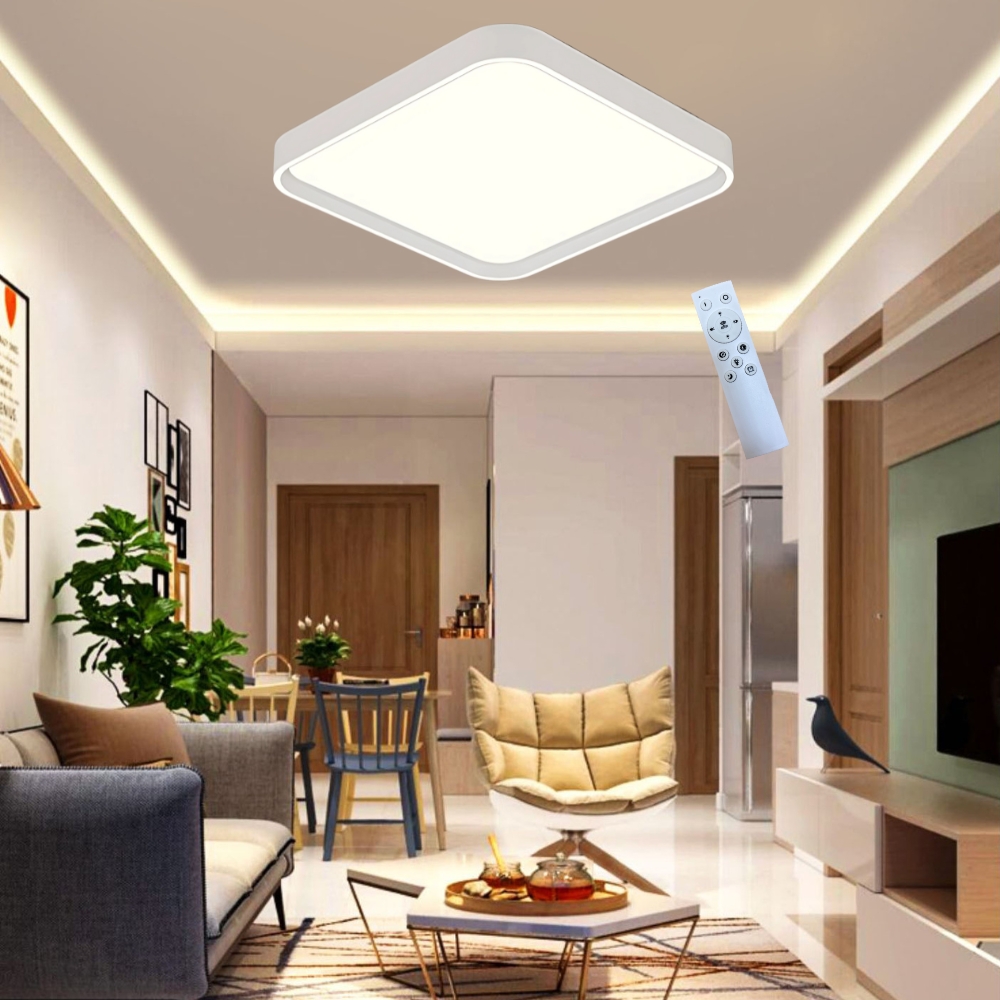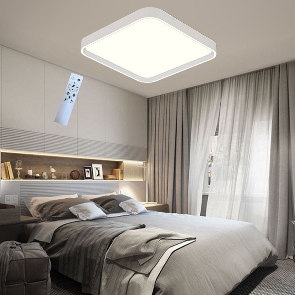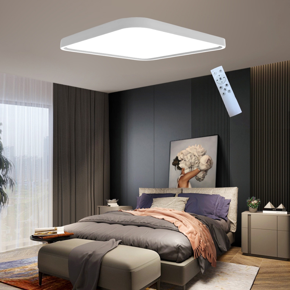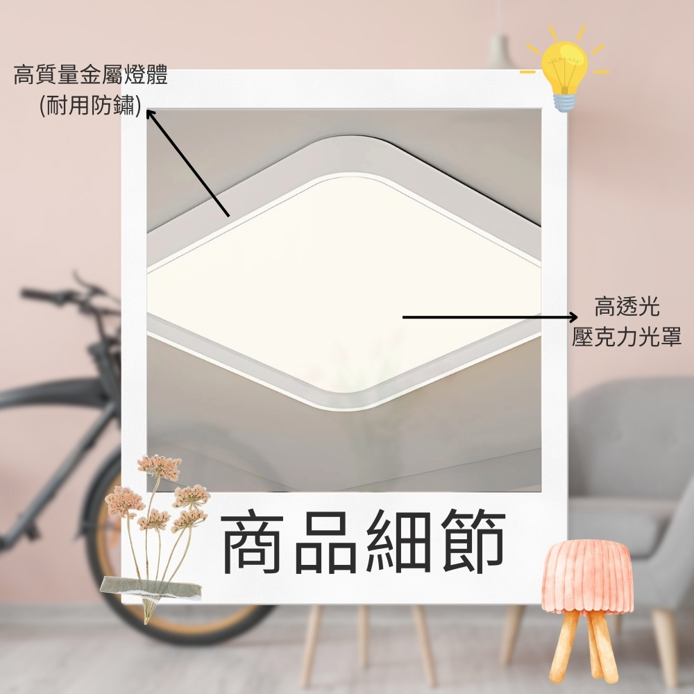 品名 LED 60W 淺白 (方型) 調光調色吸頂燈(附遙控器) 材質 金屬燈體、壓克力燈罩 尺寸 長寬約50cm * 高度約4.5cm 光源 內附LED 60W光源 (附遙控器/可調光調色) 適用 約4-5坪