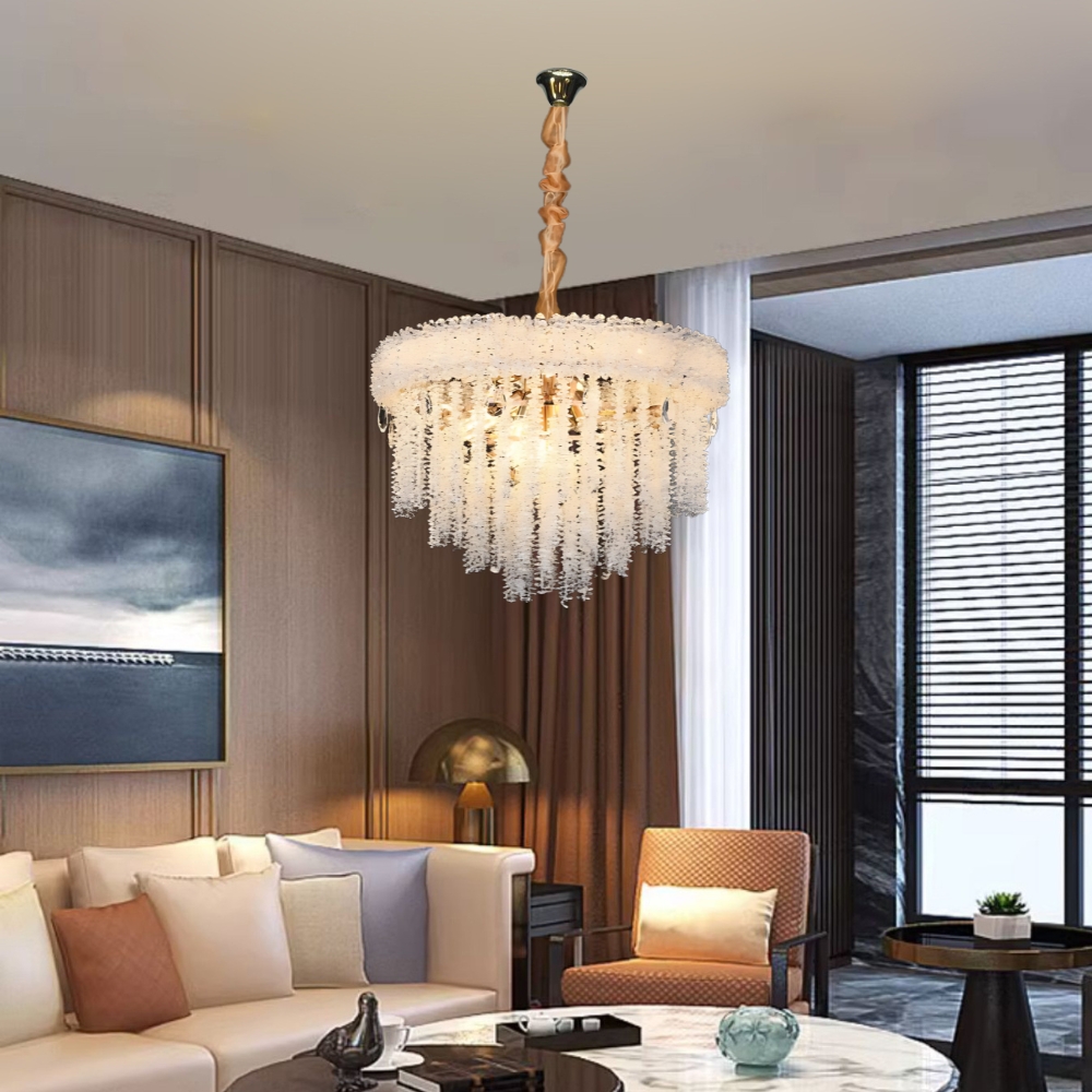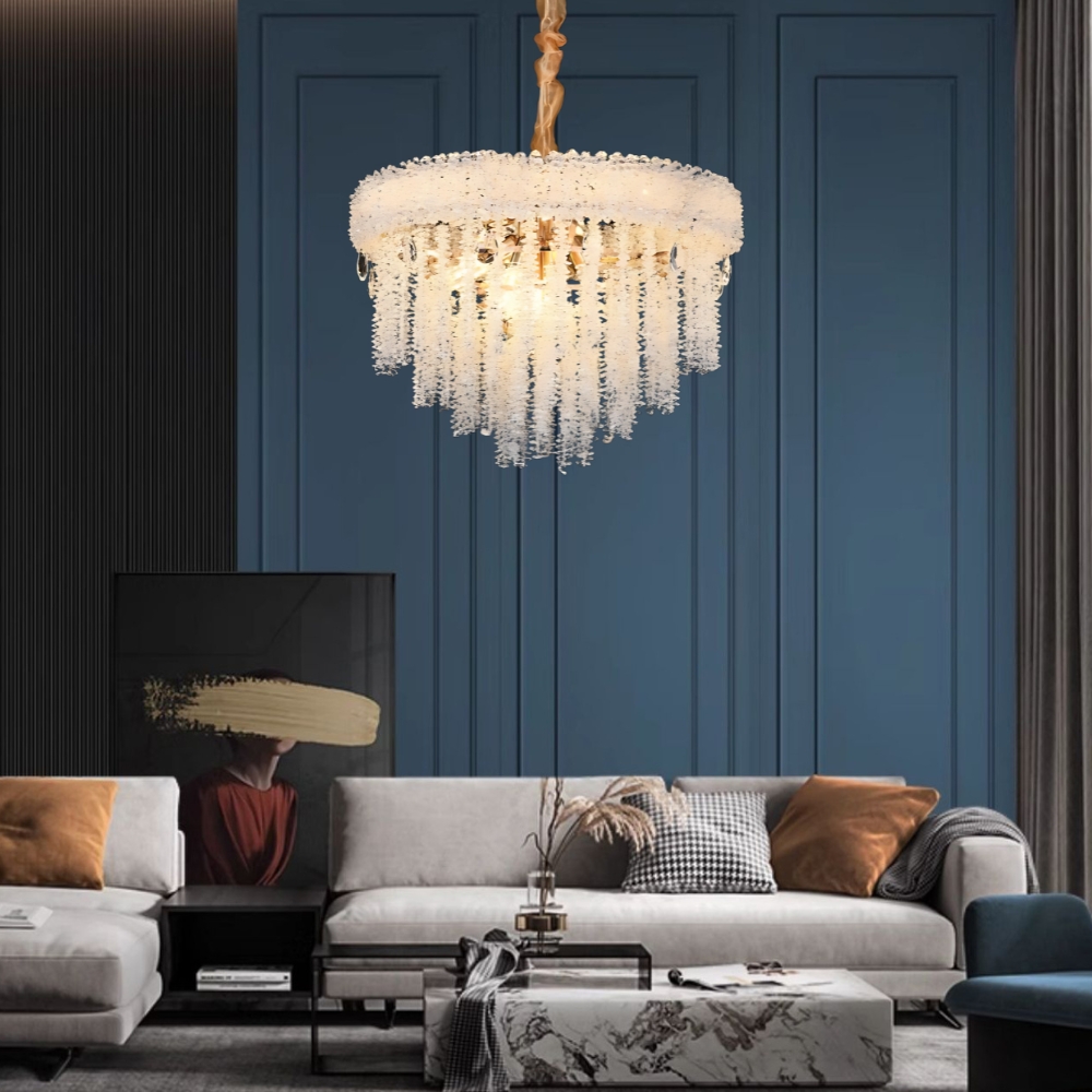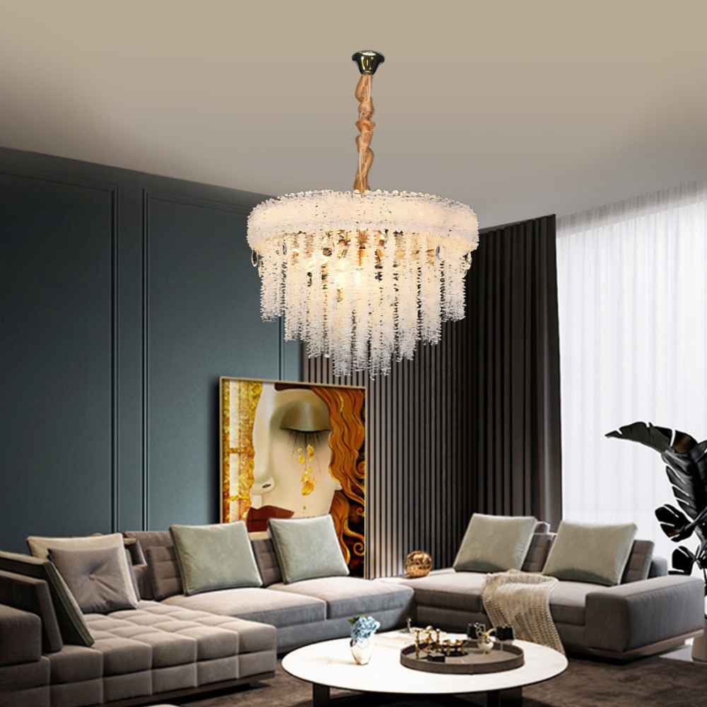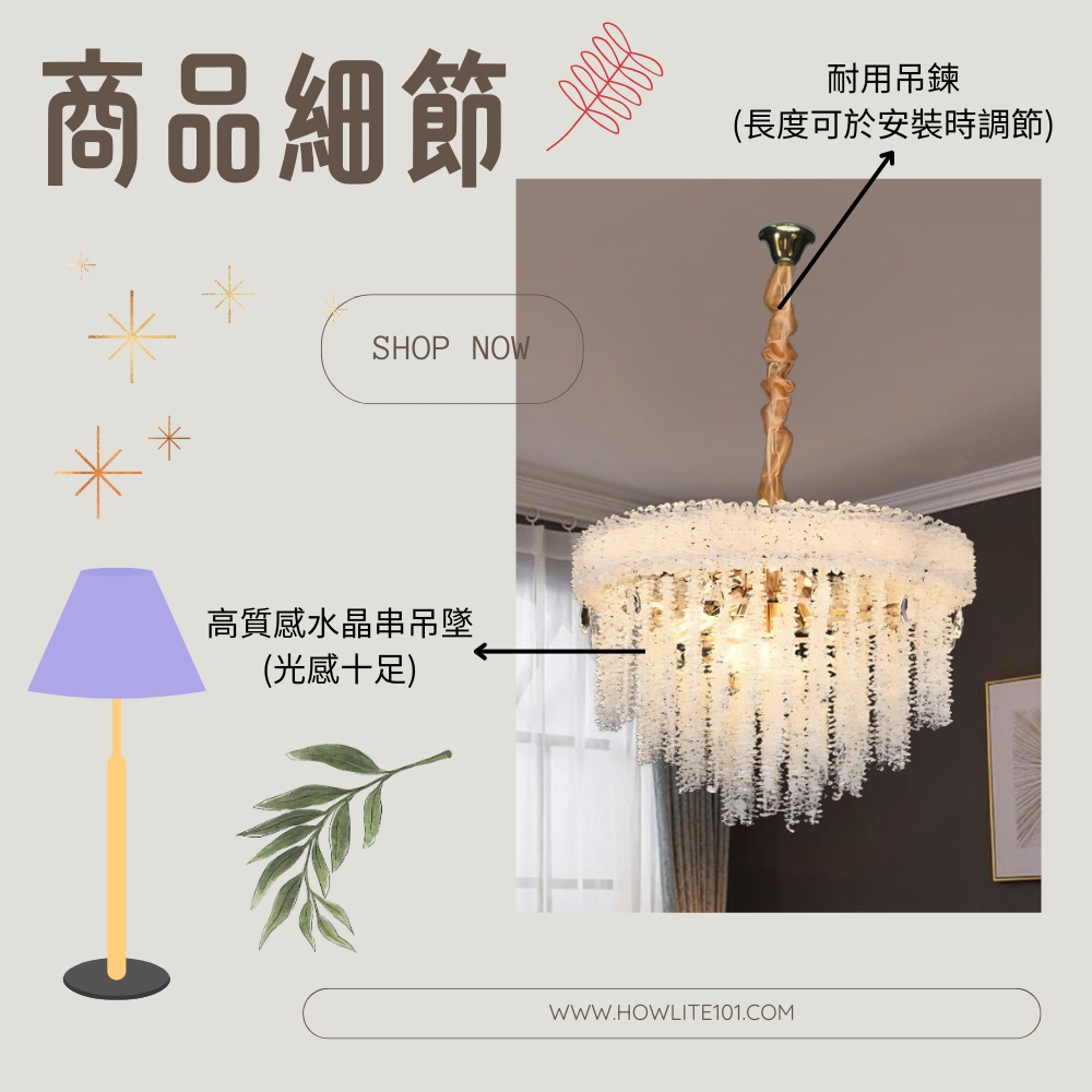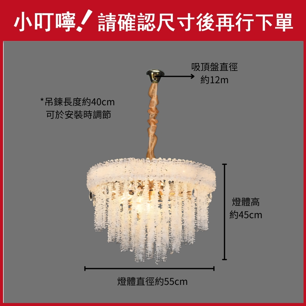 品名 織夢水晶 12 燈吊燈 材質 金屬燈體 + 水晶片 尺寸 燈體直徑約55cm * 高約45cm * 吸頂盤長約12cm (*吊鍊長度40cm可於安裝時調整) 光源 另購E14燈頭燈泡*12 適用 約4-6坪