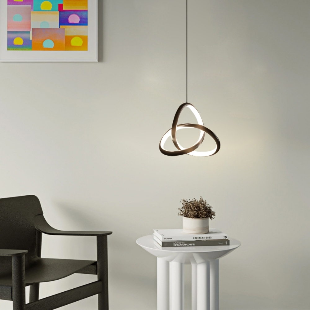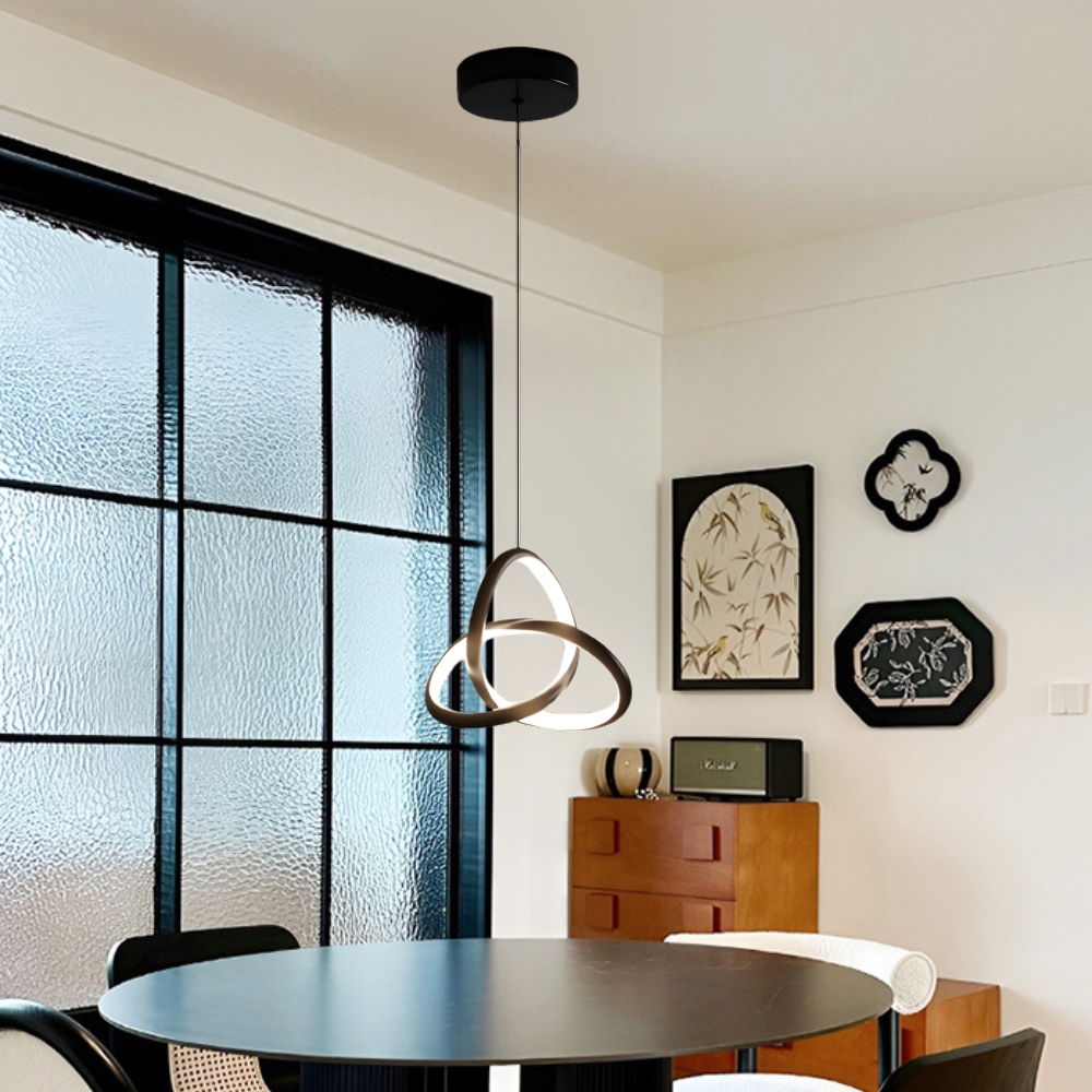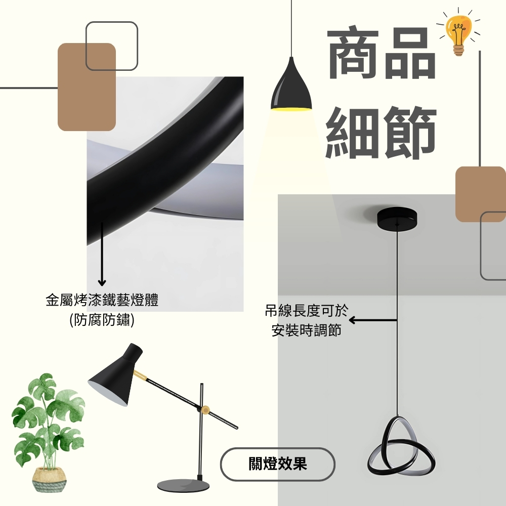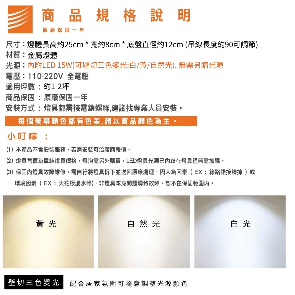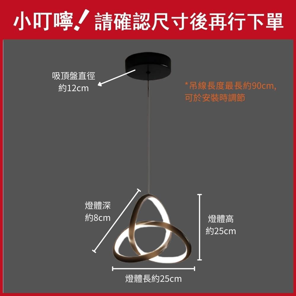 品名 LED 15W 交集吊燈(三色光) 材質 黑色金屬燈體 尺寸 燈體長約25cm * 高約25cm * 寬約8cm 吸頂盤長約12cm (*吊線長度90cm可於安裝時調整) 光源 內附LED 15W (可壁切三色變光:白/黃/自然光) 適用 約1-2坪