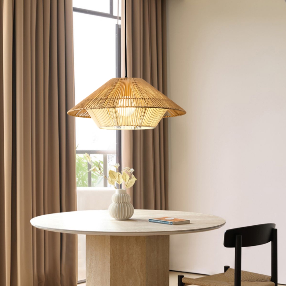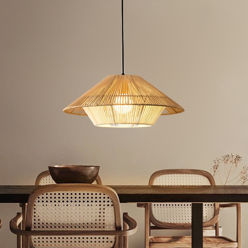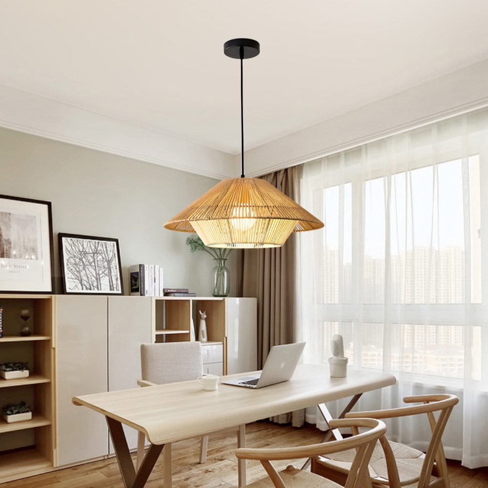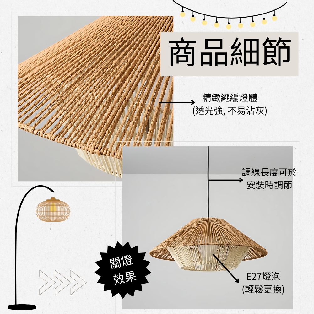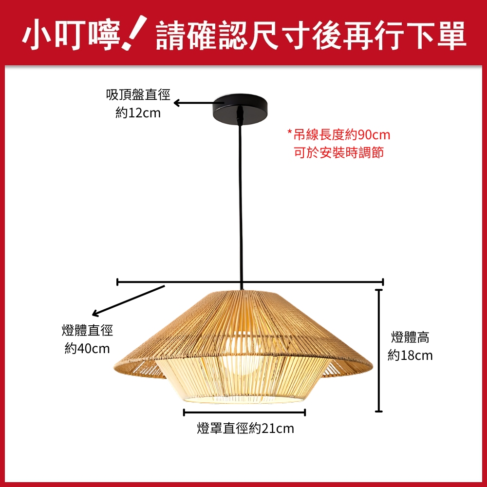 品名 搖擺單吊燈 (繩編) 材質 金屬+繩編燈體 尺寸 燈體直徑約40cm * 高度約18cm * 燈罩直徑約21cm 吸頂盤直徑約12cm (附線約90cm 可縮短調整) 光源 需另購E27燈頭燈泡*1 適用 適用約1-2坪