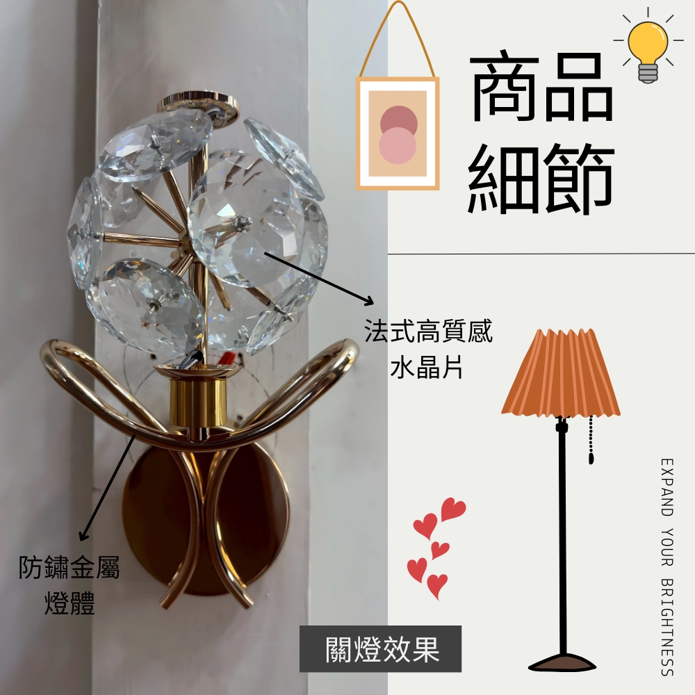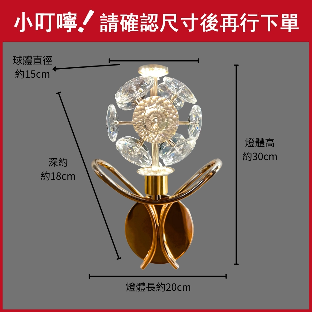 品名 LED 10W 克萊拉單壁燈 (三色光) 材質 金屬燈體 + 水晶玻璃片 尺寸 燈球直徑約15cm * 燈體長約20cm * 高度約30cm * 深約18cm 吸頂盤直徑約12cm 光源 內附LED 10W (可壁切三色變光:白/黃/自然光) 適用 適用約1坪內