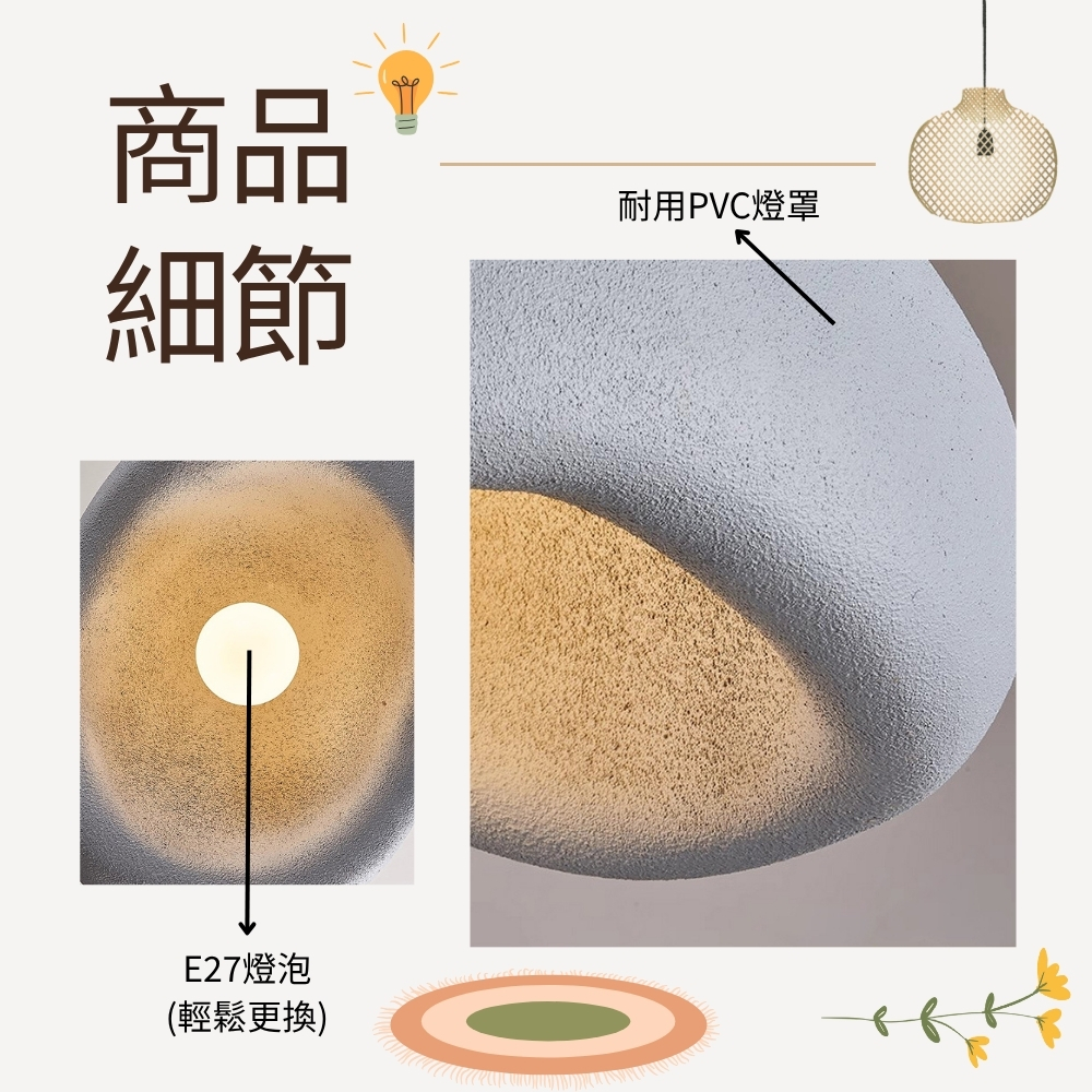 品名 獨處(灰色)單吊燈 材質 金屬燈體 + PVC燈罩 尺寸 燈體長約28cm * 寬約23cm * 高度約20cm 吸頂盤直徑約12cm (附線約90cm 可縮短調整) 光源 需另購E27燈頭燈泡*1 適用 適用約1-2坪
