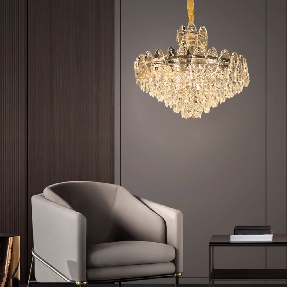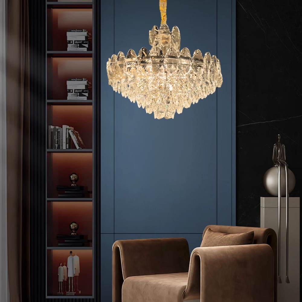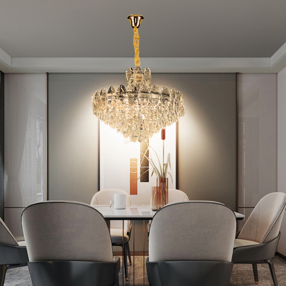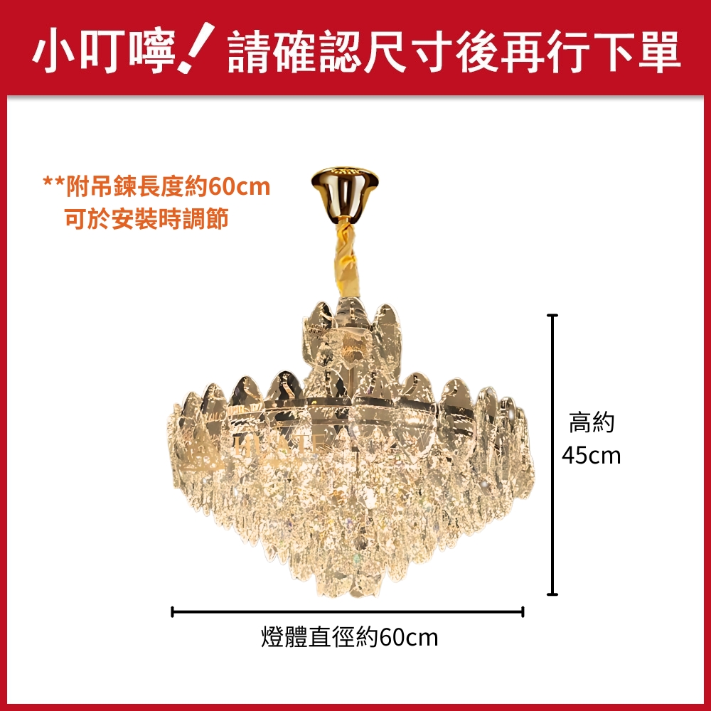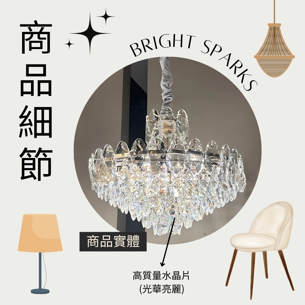 品名 黛西水晶 12 燈吊燈 (E14) 材質 金屬燈體 + 水晶玻璃片 尺寸 燈體直徑約60cm * 高度約45cm 吊鍊長度約60cm 光源 另購E14*12 (適用三色燈泡) 適用 適用約4-5坪