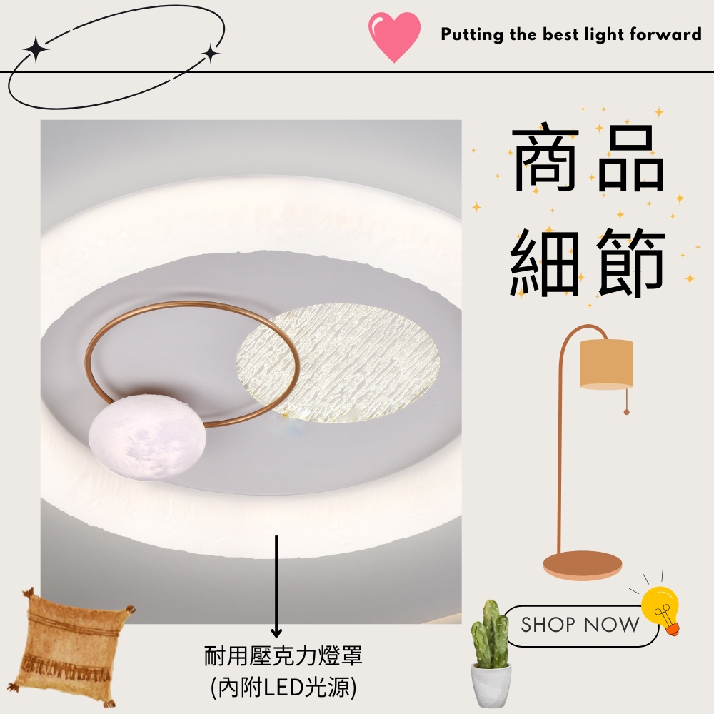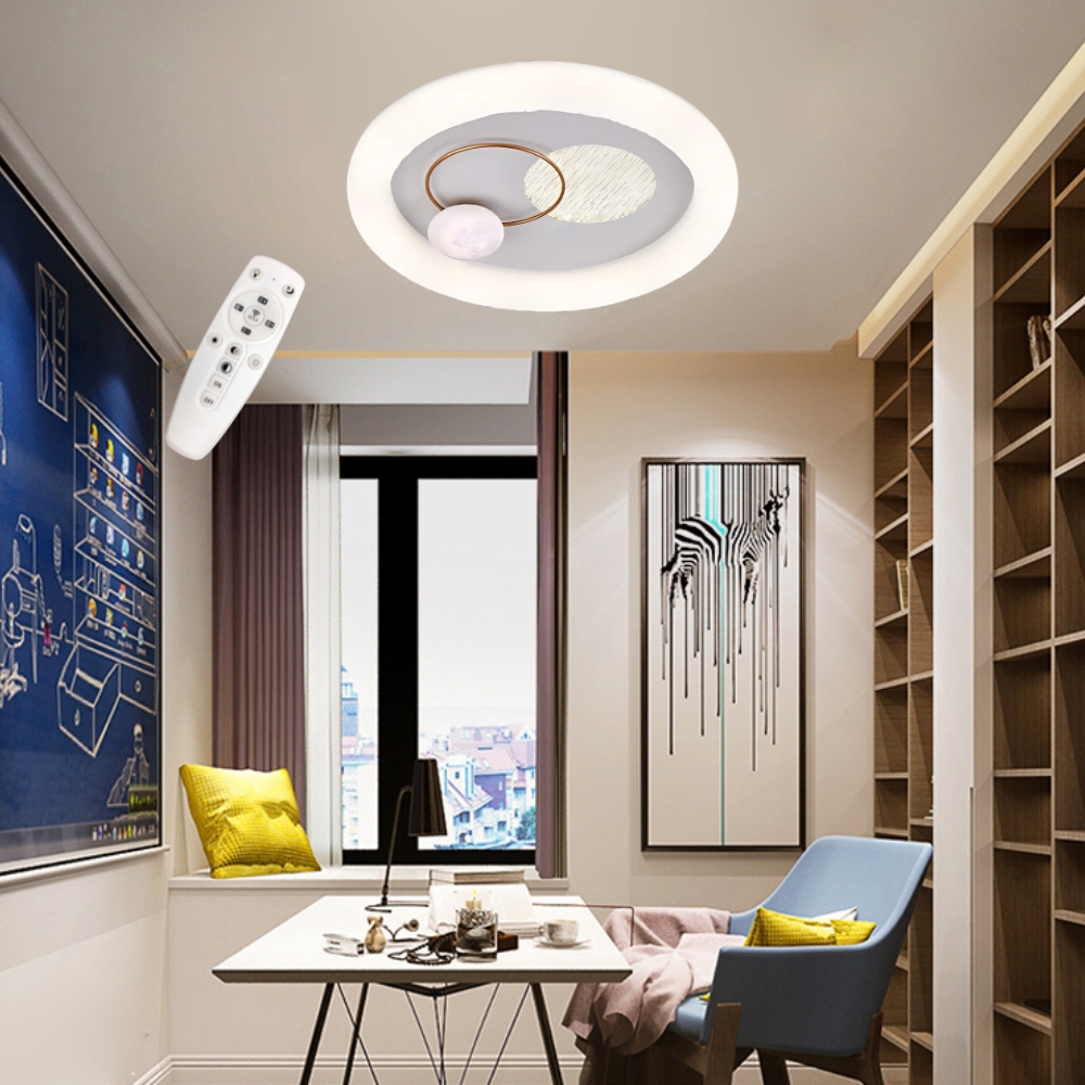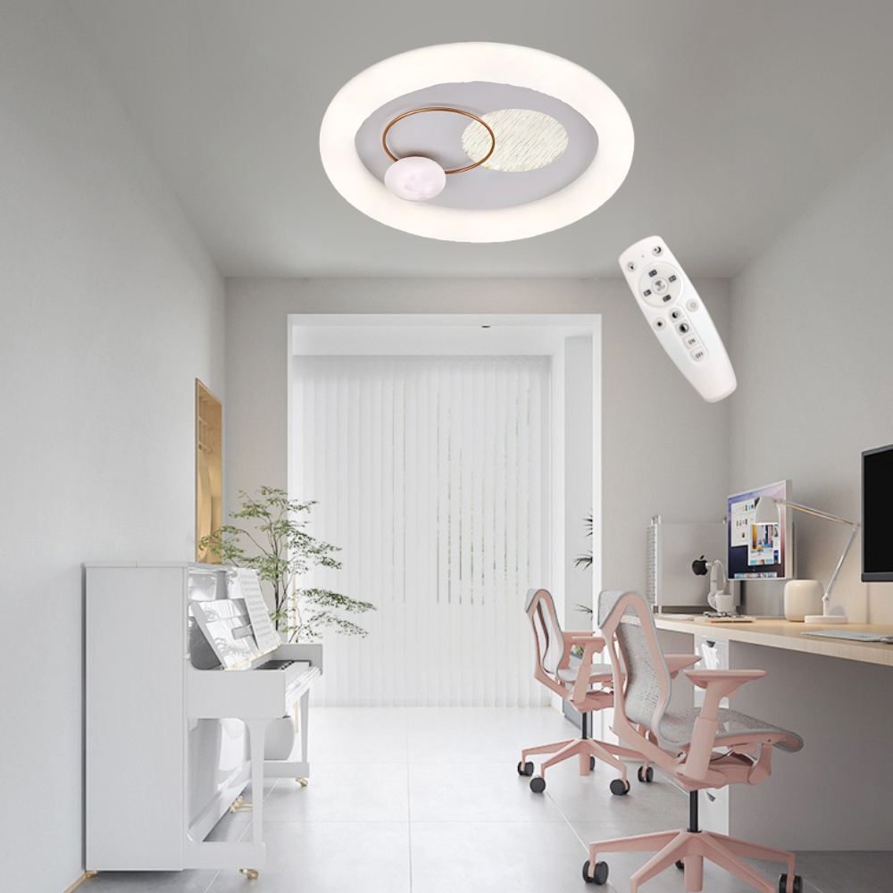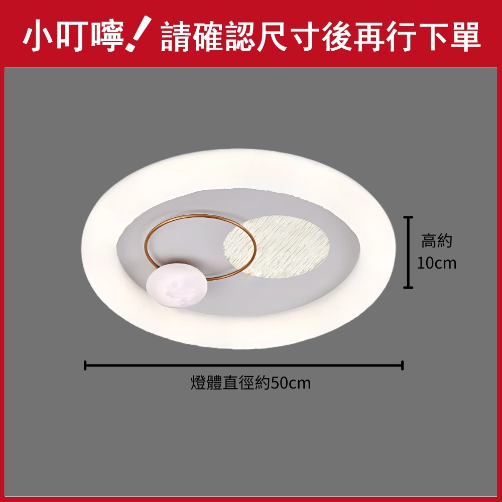 品名 LED 45W 遨遊調光調色吸頂燈 (附遙控器) 材質 金屬燈體、壓克力燈罩 尺寸 燈體直徑約50cm * 高度約10cm 光源 內附LED 45W光源 (附遙控器/可調光調色) 適用 約3-4坪