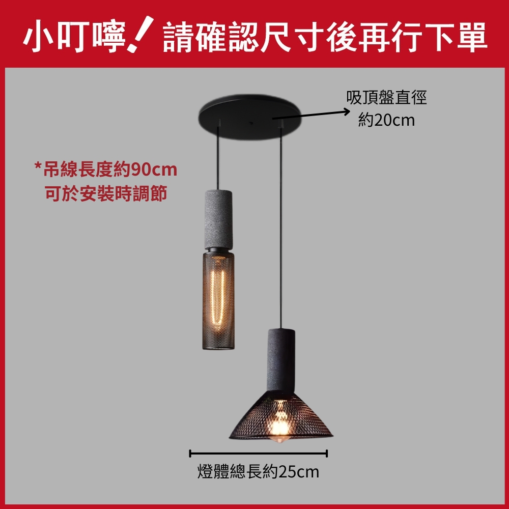 品名 凱爾達 2 吊燈 (附LED燈泡) 材質 金屬燈體 + 鐵藝燈罩 尺寸 燈體總長約25cm * 吸頂盤直徑約20cm (附線約90cm 可縮短調整) 光源 附LED工業風燈泡*2 適用 適用約2-3坪