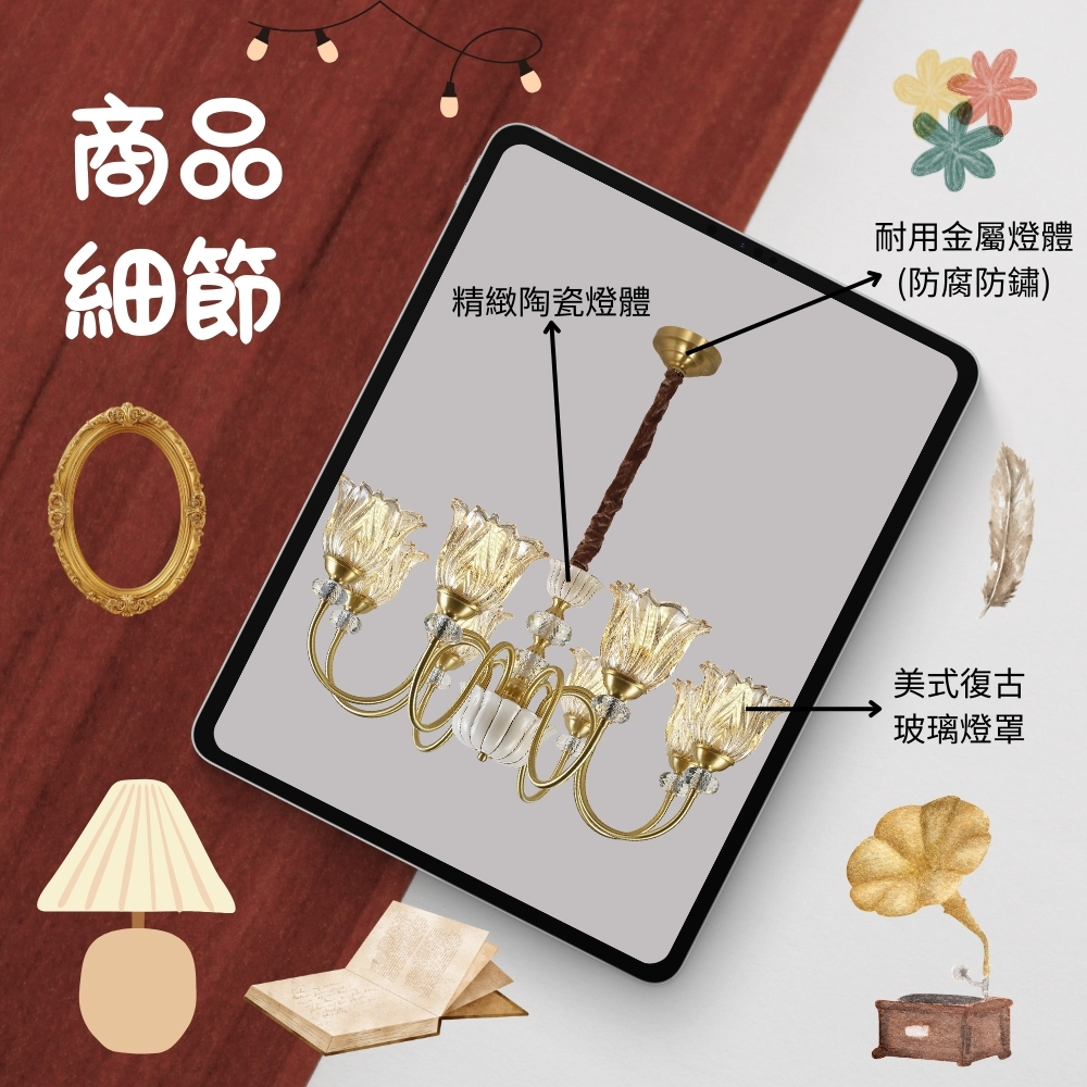 材質 純銅/陶瓷燈體 + 復古玻璃燈罩