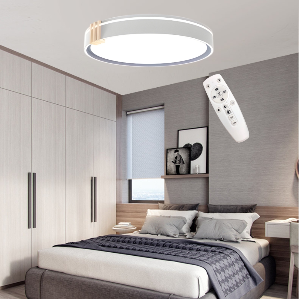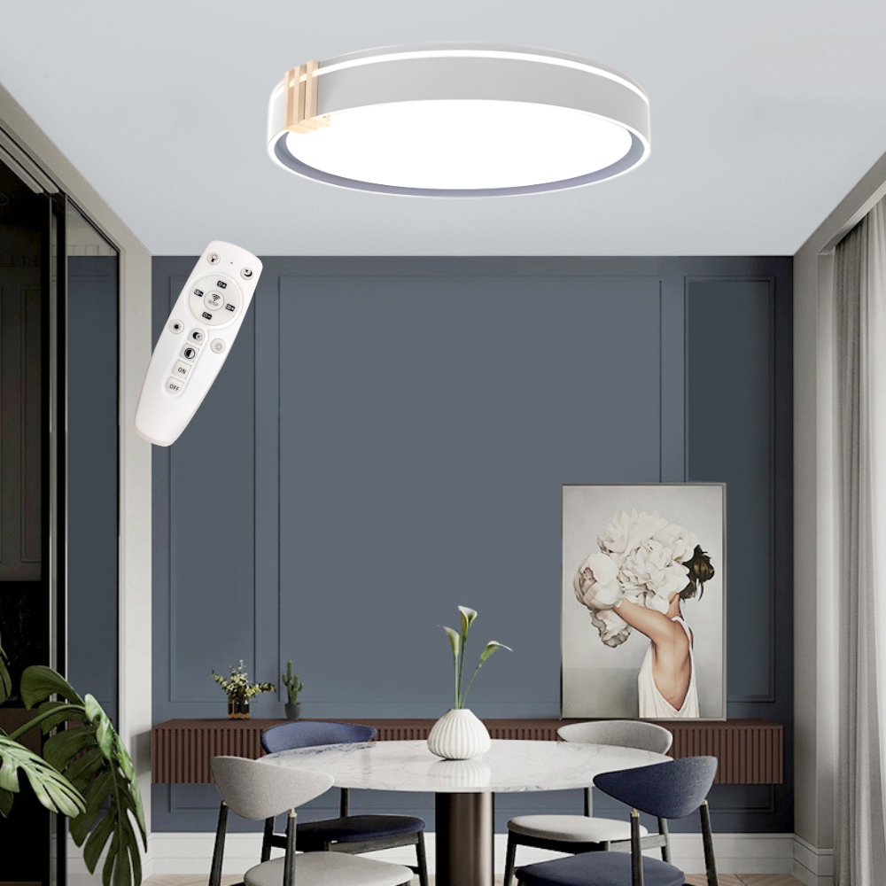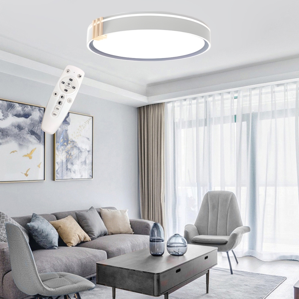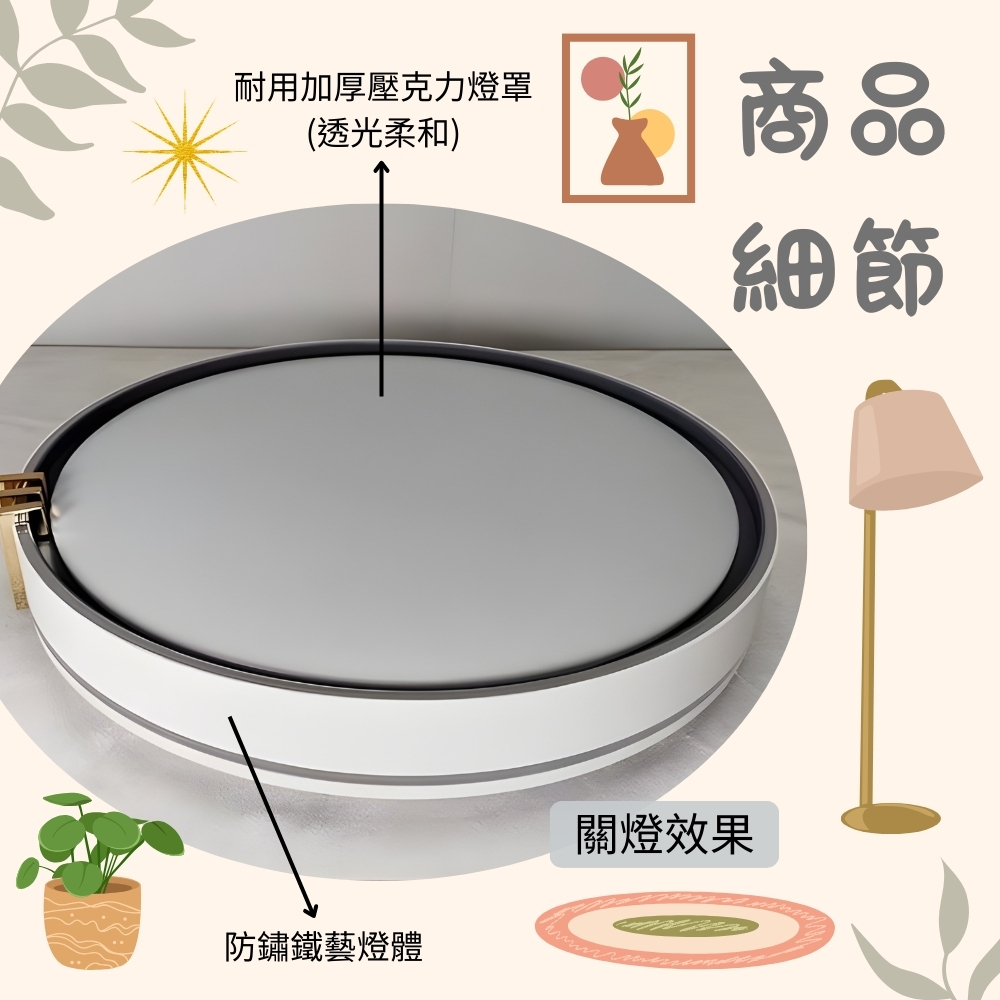 品名 LED 60W 睿智調光調色吸頂燈 (附遙控器) 材質 金屬烤漆燈體、壓克力燈罩 尺寸 直徑約50cm * 高度約10cm 光源 內附LED 60W光源 (附遙控器/可調光調色) 適用 約5-6坪