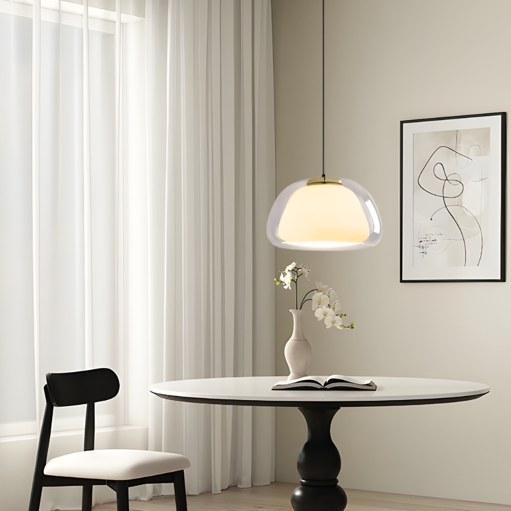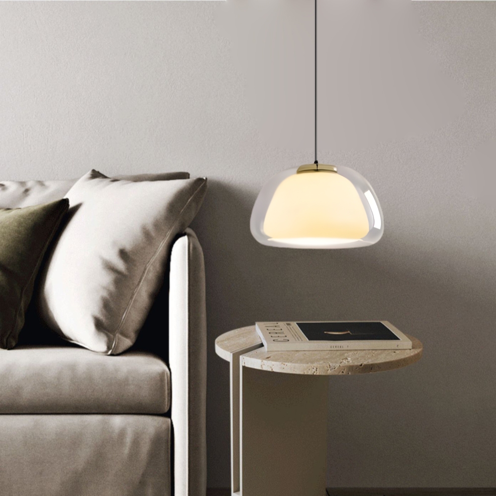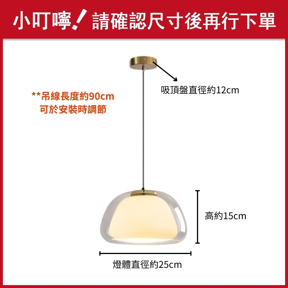 品名 逐光單吊燈 (附E27三色光燈泡) 材質 金屬燈體 + 雙層玻璃燈罩 尺寸 燈體直徑約25cm * 高度約15cm 吸頂盤直徑約12cm (附線約90cm 可縮短調整) 光源 附E27三色光燈泡*1 適用 適用約1坪